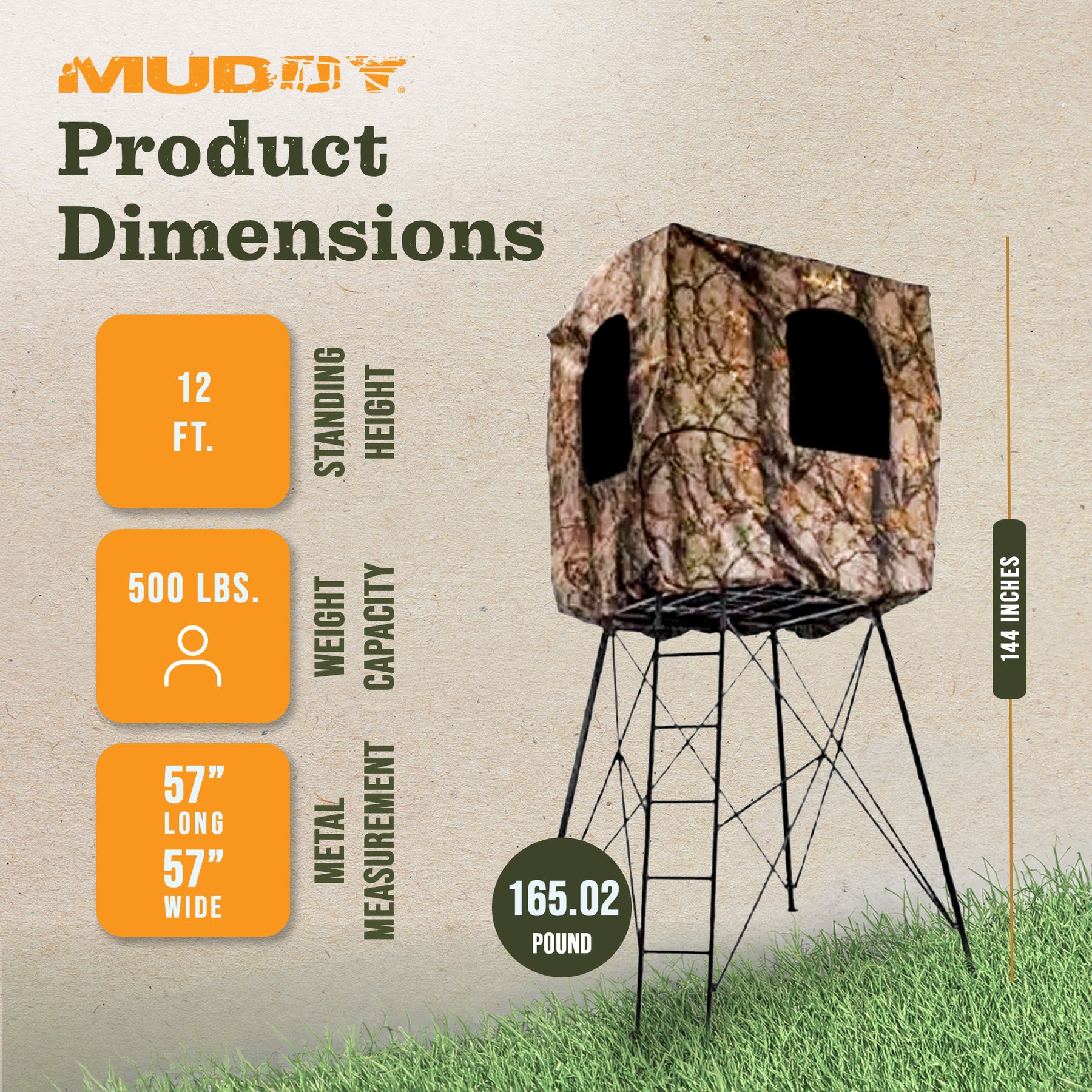 Elevate your hunting journey with the highest durability, stability, and an elevated perspective with this Muddy Quad Pod Hunting Stand. Built with rugged steel construction, this stand can support up to 500 pounds, making it a reliable choice for diverse hunting scenarios. With a platform measuring 57 inches long by 57 inches wide, it offers ample space for movement and gear placement.