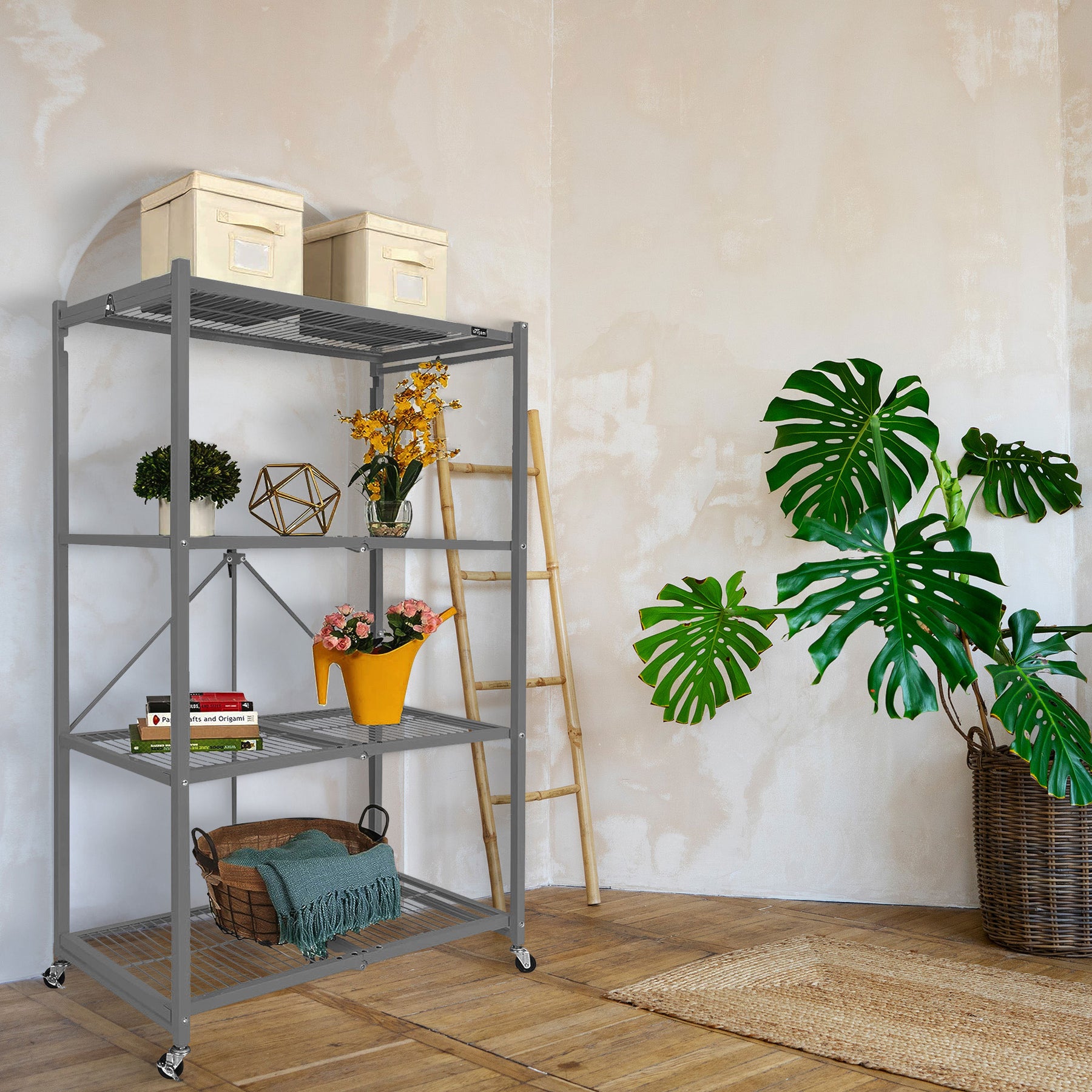 Origami R5 Foldable 4 Tier Storage Rack w/ Wheels, Pewter, Certified Refurbished