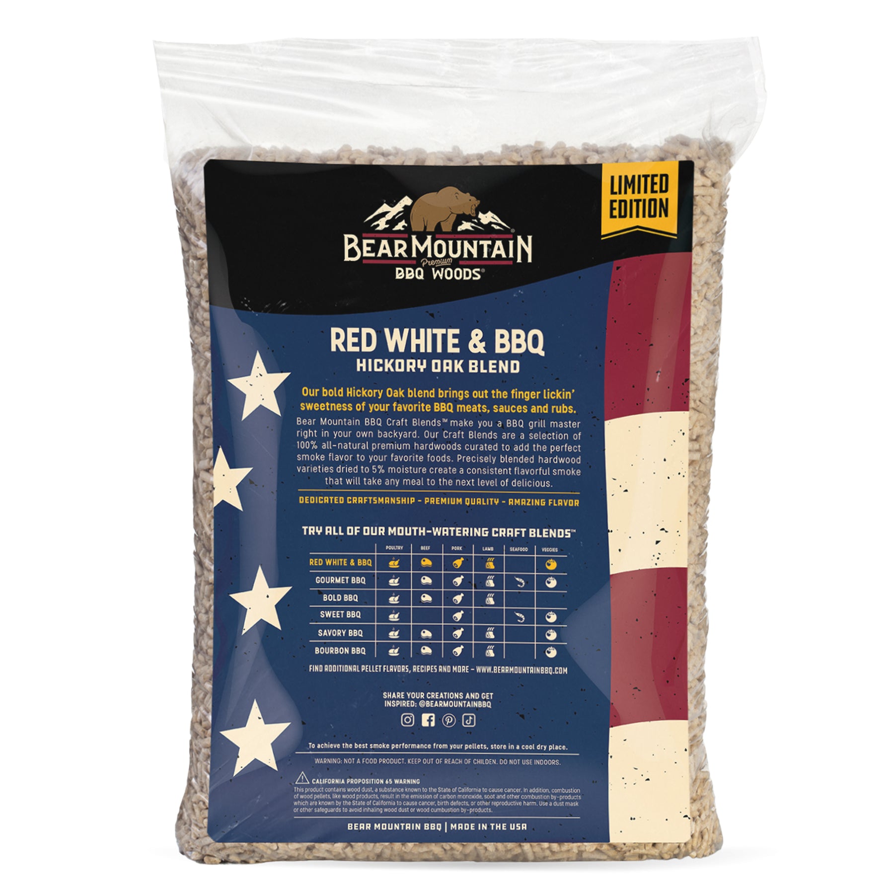 - Authentic American Flavor: Celebrate with our limited-edition Red White & BBQ wood pellets - a patriotic blend of hickory and oak for robust, wood-smoked flavor