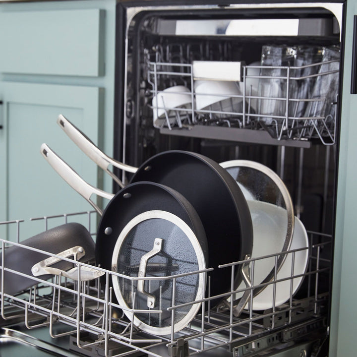 Crafted from hard-anodized aluminum, each piece offers fast, even heating and is built to stand up to the rigors of busy kitchens. The exterior is dishwasher-safe, making cleanup quick and hassle-free. This cookware set is compatible with gas, electric, and glass stovetops, and is oven-safe up to 450°F, allowing for seamless transitions from stovetop to oven.