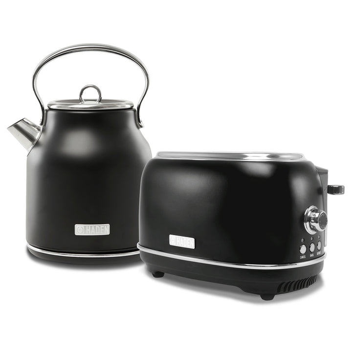 Inspired by British homes, architecture, and landscapes, this HADEN Heritage toaster and kettle feature a chic Black & Chrome color scheme.