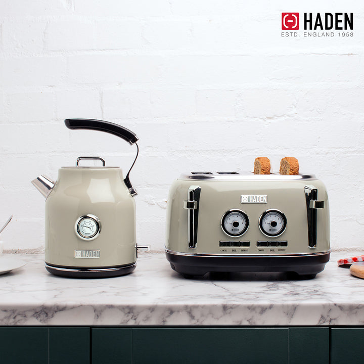 Inspired by British homes, architecture, and landscapes, this Haden Dorset toaster and kettle feature a chic Putty & Chrome color scheme.