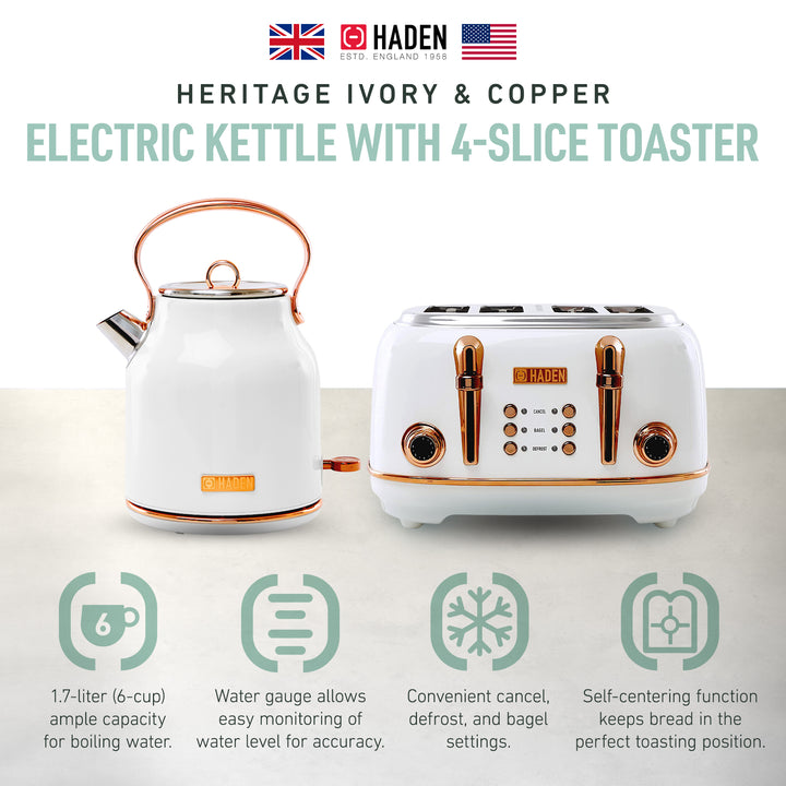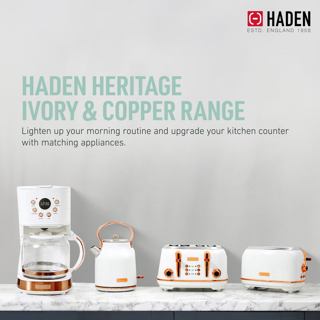 Haden Heritage 4 Slice Wide Slot Toaster & Electric Water Kettle, Ivory & Copper