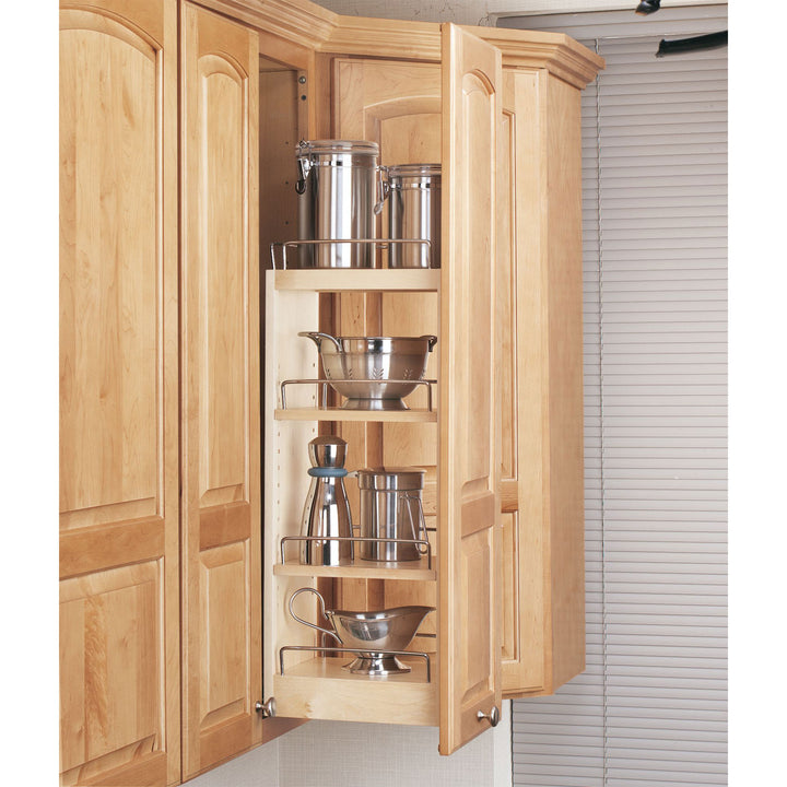 Your seasonings and canned goods will always be within reach with the Rev-A-Shelf 8'' Pullout Wood Wall Cabinet Organizer. This handy organizer features 4 levels of shelving for maximum storage space and easy access.