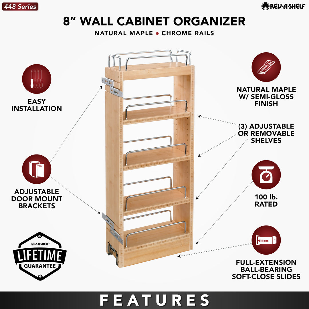 Streamline your kitchen with the Rev-A-Shelf 8'' Pullout Wood Wall Cabinet Organizer.