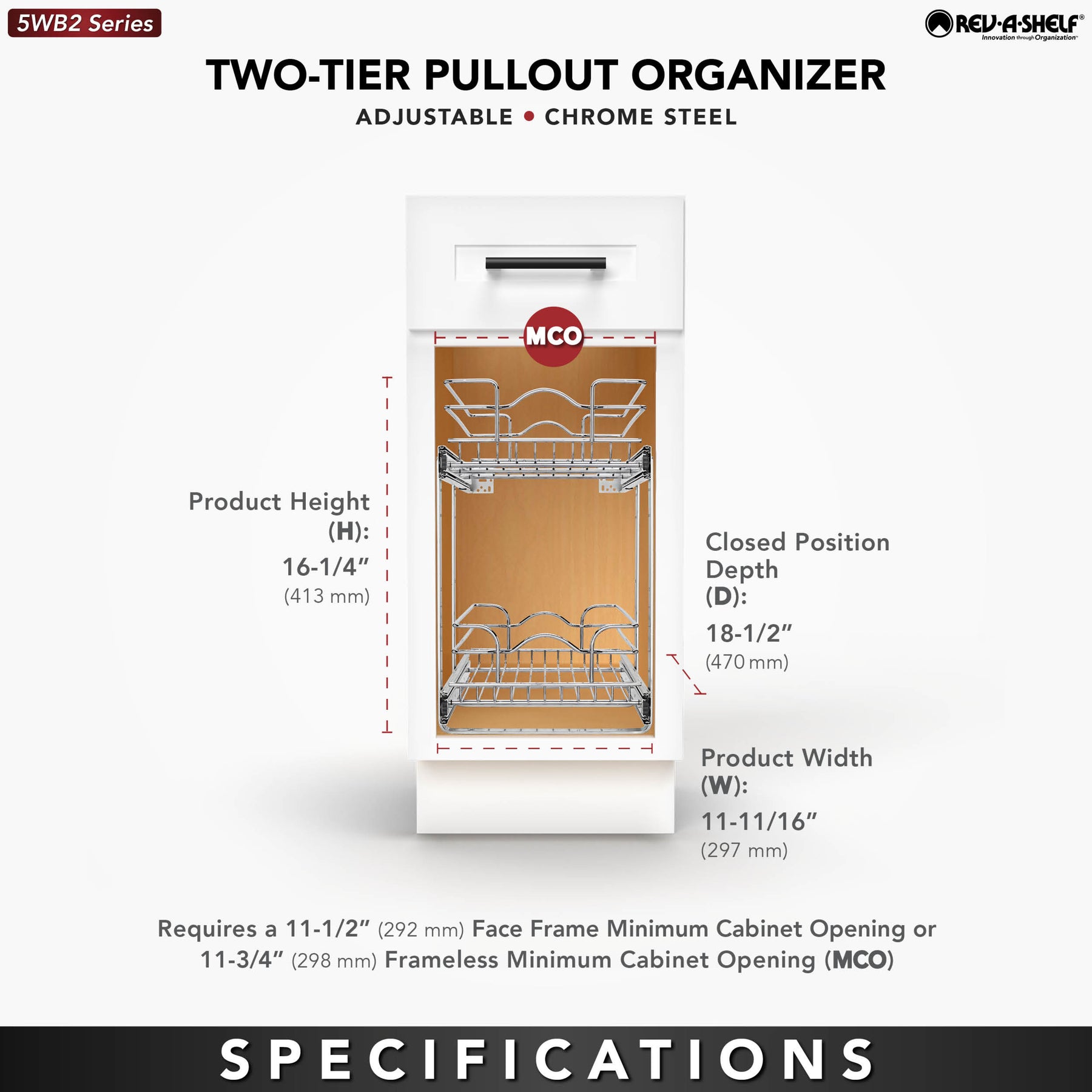- Bottom Mount Two-Tier Pullout Steel Wire Organizer to access pots, pans, lids, bottles, stand mixers, and other kitchen accessories