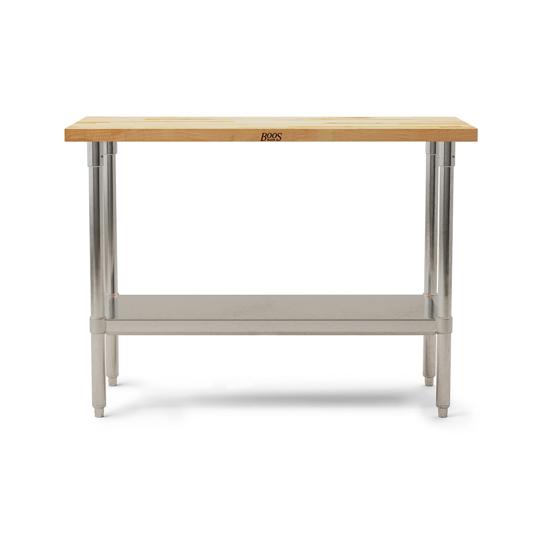 You can never have too much room to work. Expand your space with John Boos Maple Wood Top Work Table with an Adjustable Lower Shelf. The edge grain blended maple table features a smooth surface top with a food-safe oil finish to resist spills and stains.
