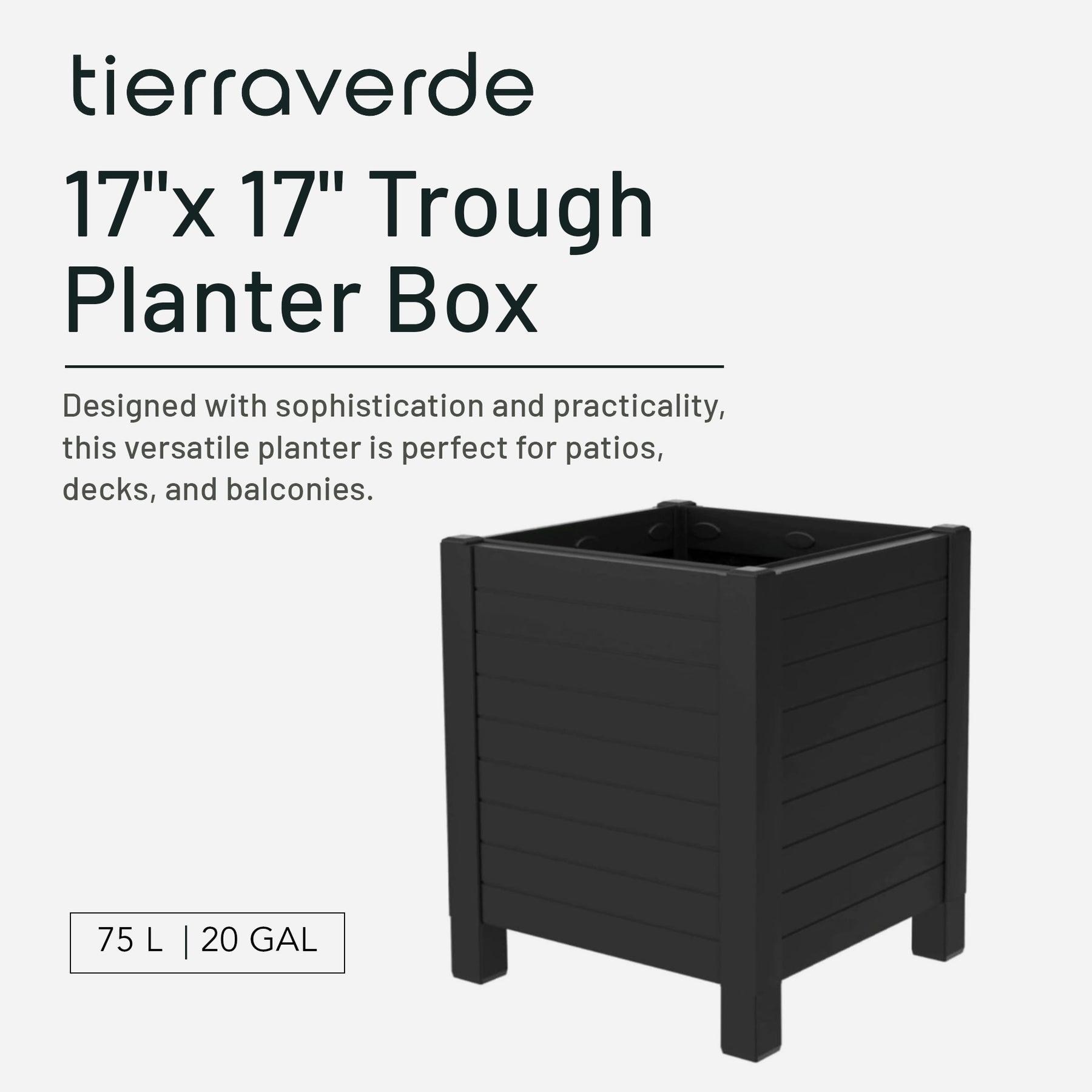 Elevate your outdoor living space with the sleek, modern charm of the Tierra Verde 17-Inch by 17-Inch Flora Cube Planter Box. Designed with sophistication and practicality in mind, this versatile planter is the perfect addition to patios, decks, balconies, or even indoor settings. Its contemporary cube silhouette blends effortlessly with any décor, bringing structure and style to your plant display. These planter boxes are built to hold up to 75 liters (20 gallons) of potting soil, giving you the needed room for efficient plant growth.