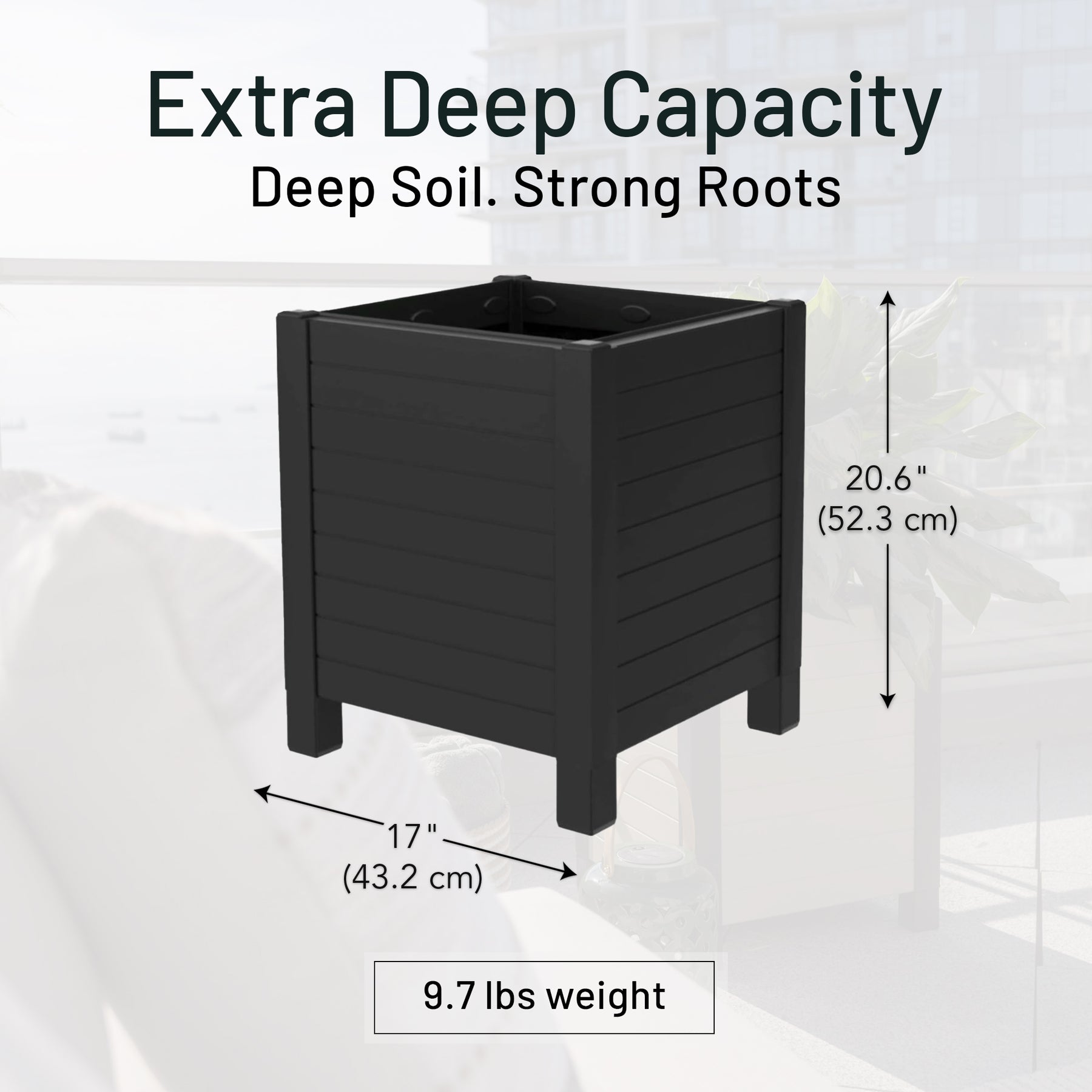 • 17-inch by 17-inch Flora Cube Planter Box adds a sleek, contemporary touch to patios, balconies, decks, or indoor spaces