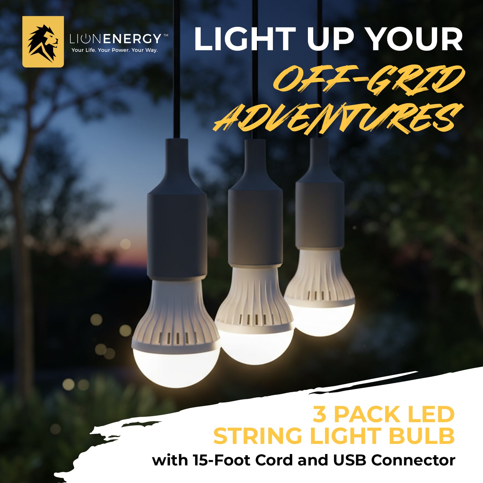 Lion Energy 3 Pack LED String Light Bulb with 15-Foot Cord and USB Connector