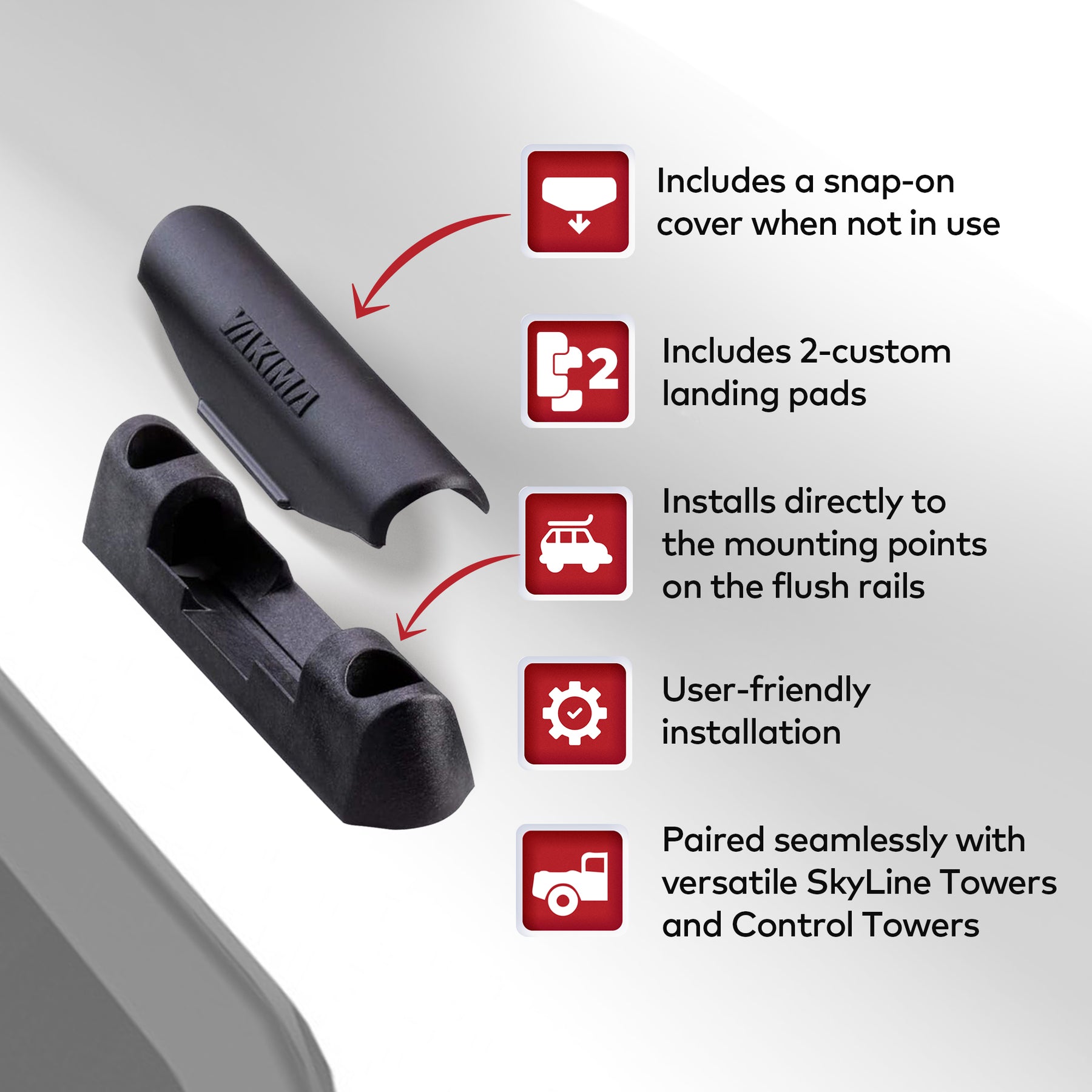 Paired seamlessly with versatile SkyLine Towers and Control Towers, it presents easy on-off loading functionality, empowering you to embark on adventures swiftly. Unveil a user-friendly installation that is as swift as it is secure, as this rack mount installs directly to the factory mounting points on the flush rails of your vehicle. The snap-on covers add a touch of convenience, safeguarding your system while maintaining its sleek profile when not in use.