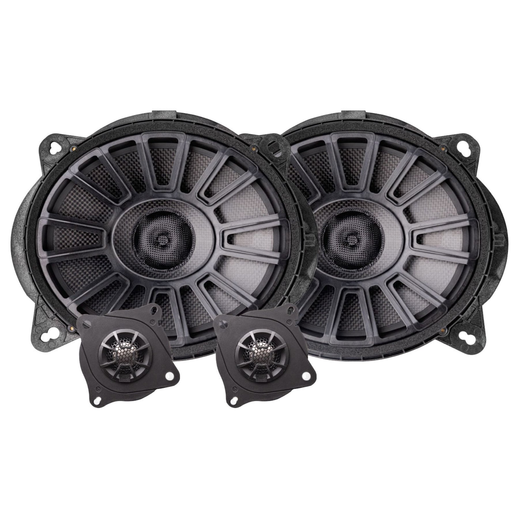- Plug-and-play OEM-style harnesses and included tweeter mounting plates simplify installation with no cutting required