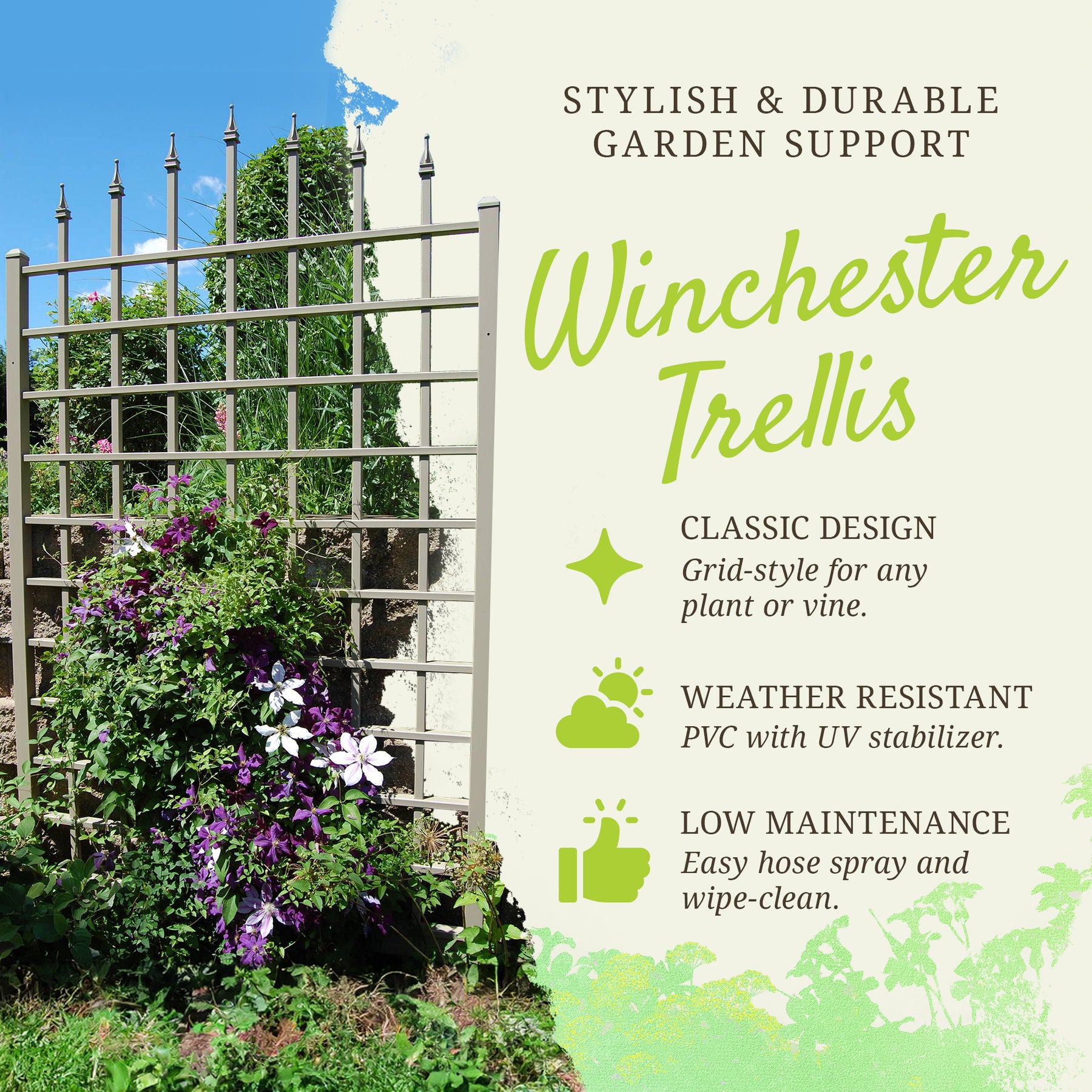 Complete your garden or plant room environment with the ​Dura-Trel Winchester 57 by 95-inch Trellis, and let your plants blossom. Elevate your gardening experience with this high-quality, low-maintenance trellis that lets your greenery take center stage.