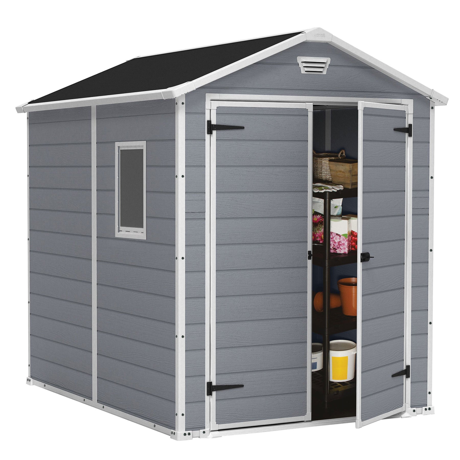 Have you ever forgotten your yard tools or equipment outside after finishing yard work, only to have them damaged by the elements? Store your lawn and garden tools all in one place with the Keter Manor Double Door Outdoor Storage Shed. This 6-foot by 8-foot tall storage shed provides plenty of storage space and a high ceiling for easy maneuverability within, ensuring all your items are organized and accessible.
