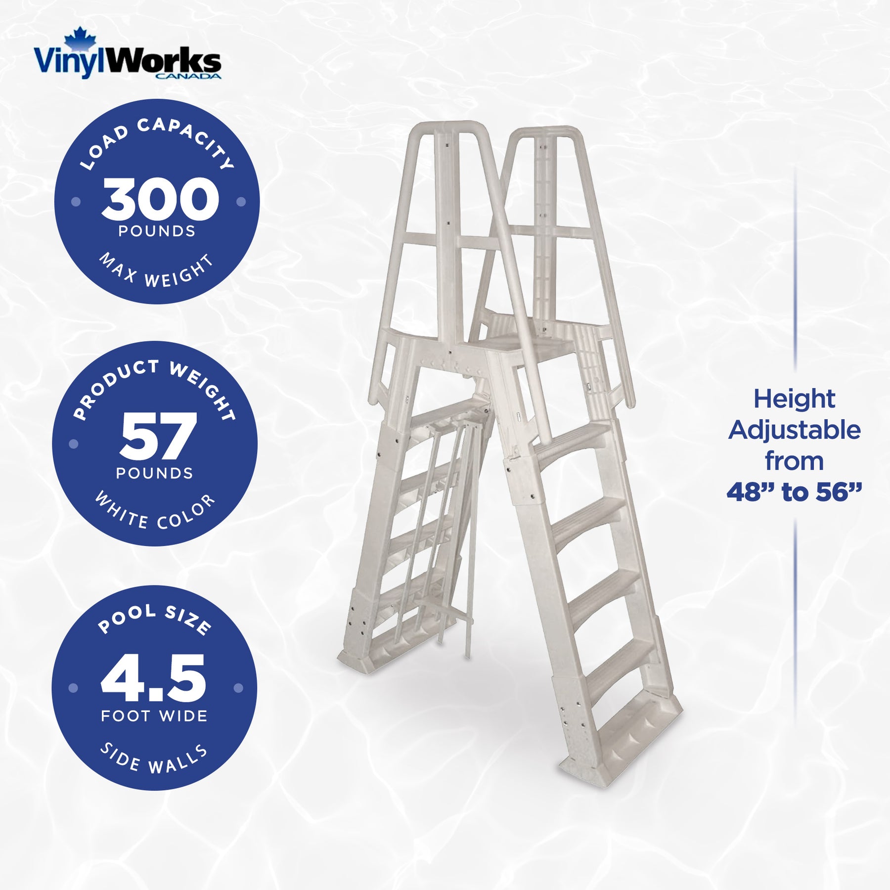 Set up an easy way to enter and exit your pool safely and securely with the Vinyl Works A-Frame Ladder with Barrier. This above-ground swimming pool ladder supports users up to 300 pounds to safely guide them in and out of your pool, with 4 base treads and a top platform tread for easy climbing and greater stability.