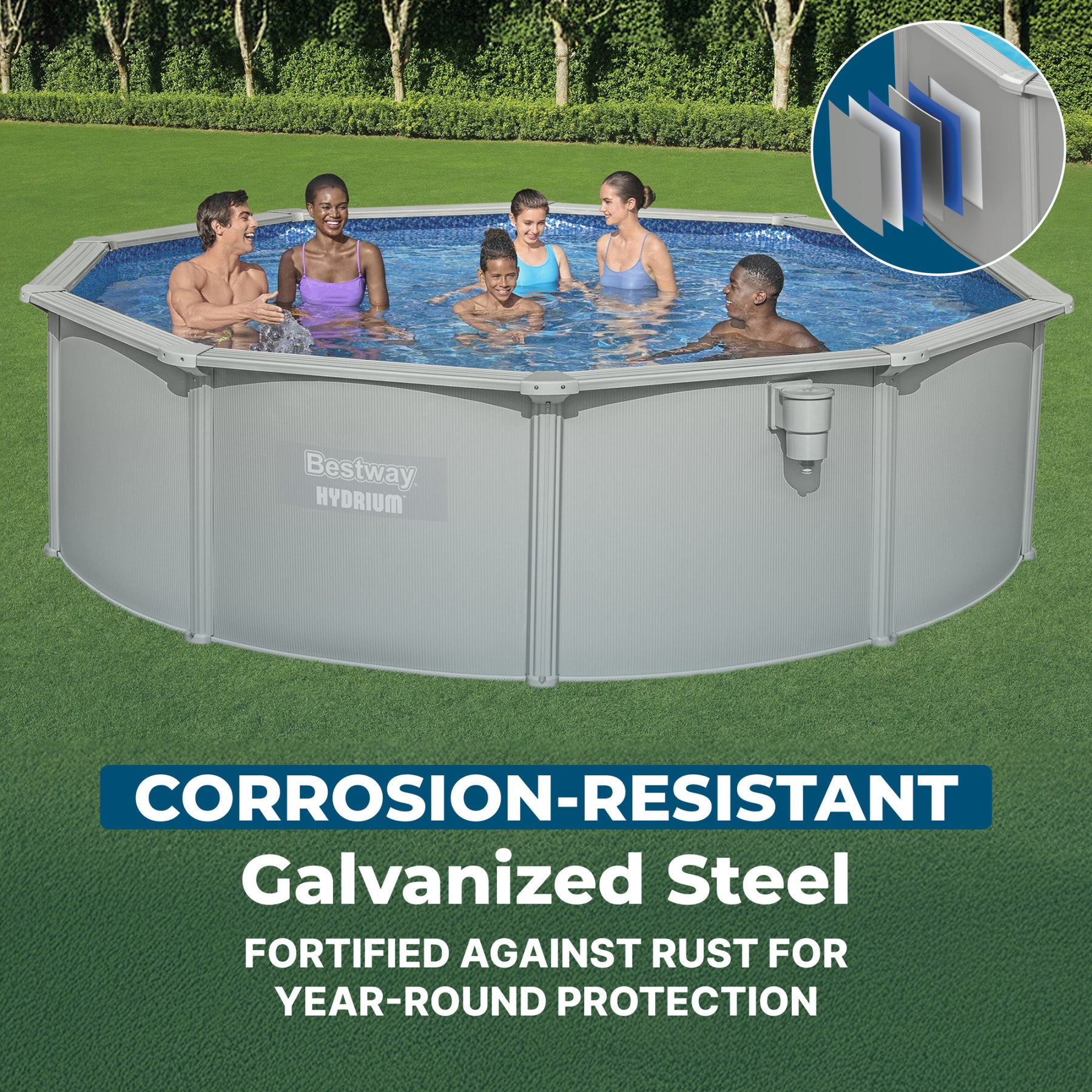 Constructed with galvanized steel that resists corrosion, this pool is built for longevity. The walls, top ledge, and frame are all made from 100 percent steel, with a zinc coating to avoid damage and rust caused by weather elements. The unique steel ridge pool wall provides extra support to ensure your backyard pool is always in top-notch shape, while the inner Prismatic Stone liner features a coating that protects your pool from discoloration or cracking under the sun. With durable construction, your family pool can remain in your backyard all year long for optimal convenience.