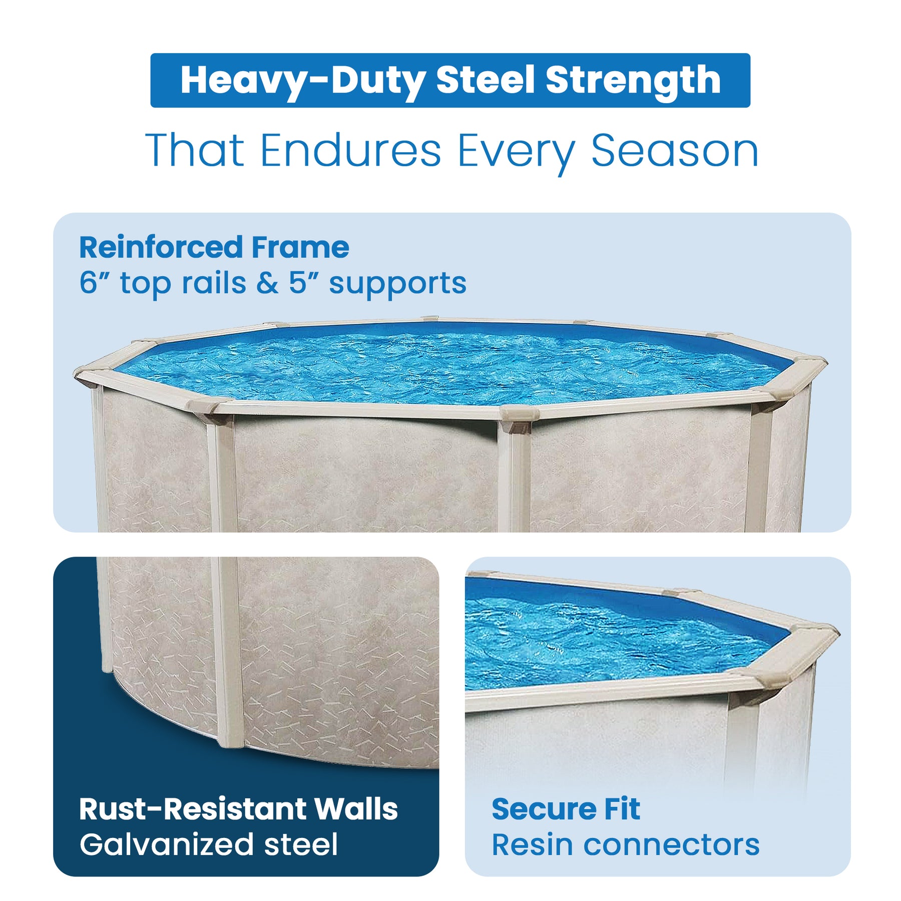 This pool is 18 feet round and 52 inches high to provide fun for all ages. The pool's all-steel construction provides durability and the precise fit sharp marble wall design adds an appealing feature and enhancement to your backyard.