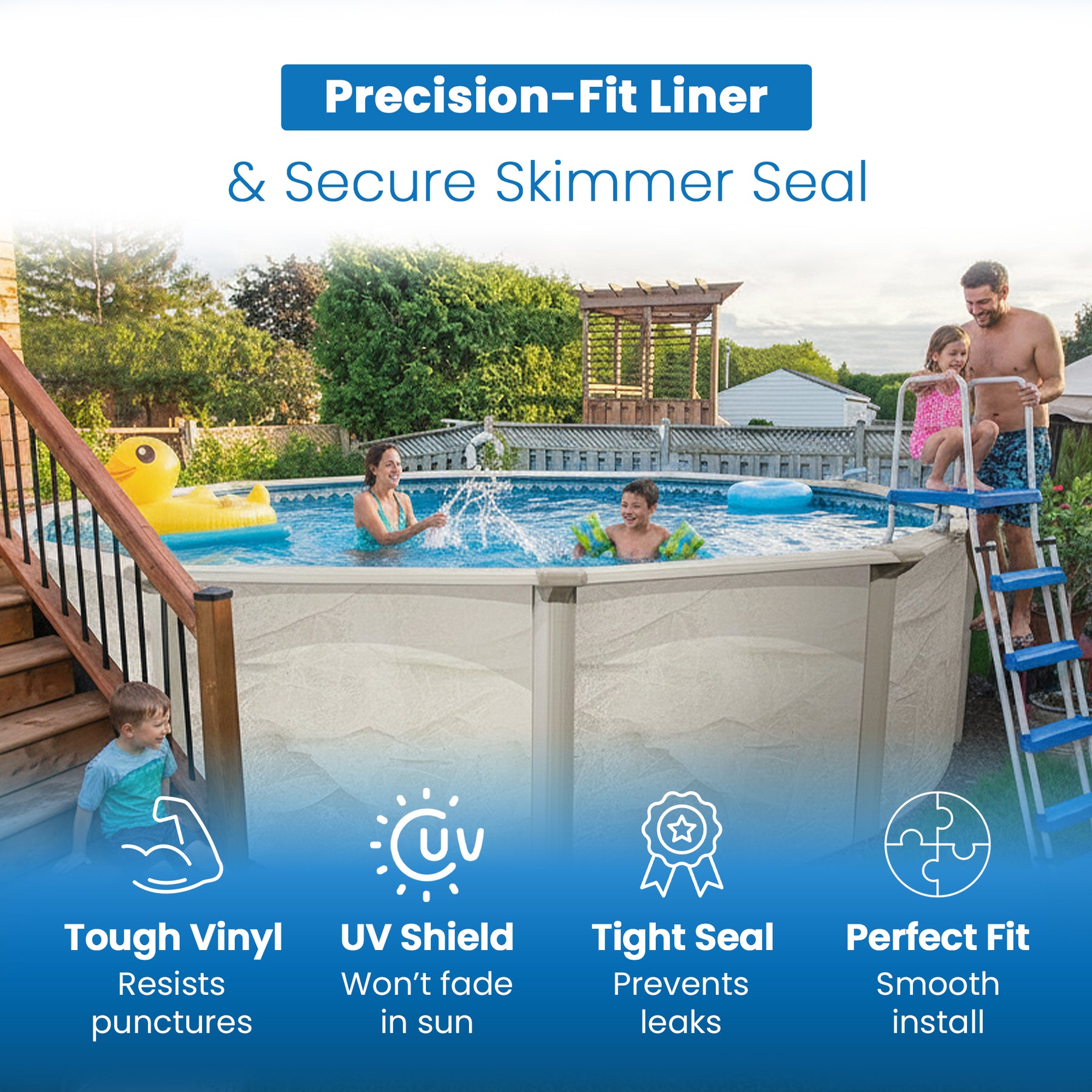 Includes premium quality solid blue overlap liner for 18-foot round above-ground swimming pools. The pool liner fits most 48 inches and 52 inches and is made from durable plastic material.