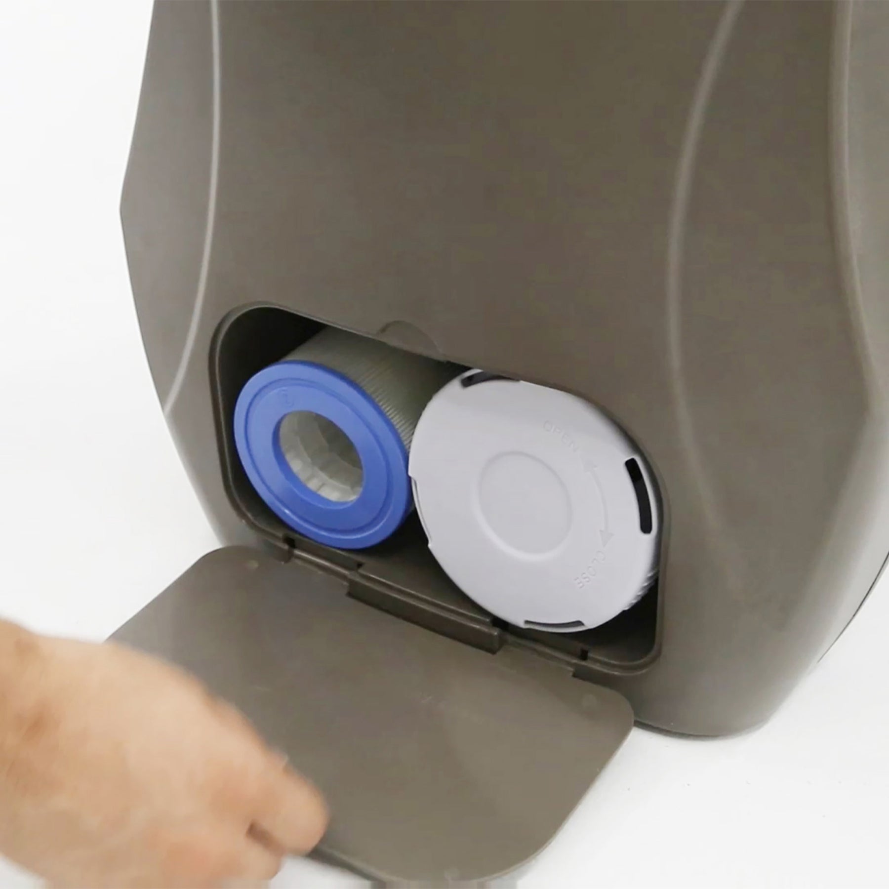 - Filter and filter cartridge are located in the back pocket of the pump