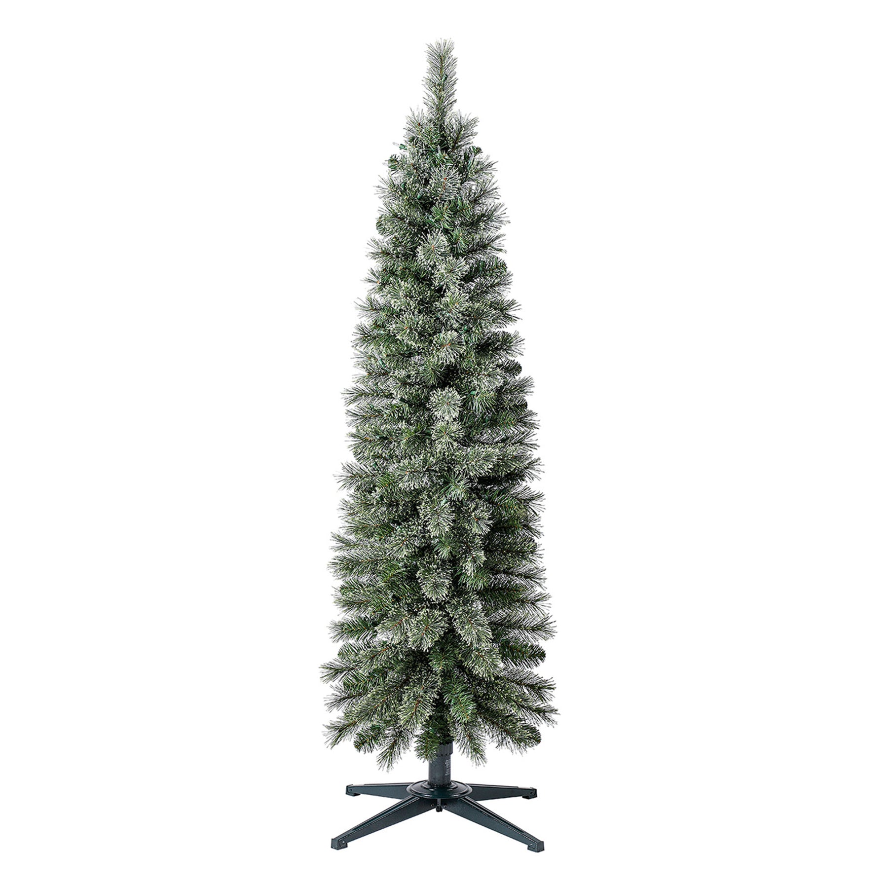 The Stanley Pencil Pine Pre-Lit Artificial Christmas Tree, standing 5 feet tall and 16 inches wide, brings festive charm to any space. Ideal for compact areas or group displays, this slim tree offers 186 lush foliage tips with a snowy finish, creating a winter wonderland look without the hassle of shedding needles. With 150 white incandescent lights and a sturdy metal stand, it's easy to set up and dismantle, adding a warm glow to holiday gatherings and lasting memories. Ideal for cozy apartments or grand foyers, this tree embodies holiday cheer and simplicity in design.