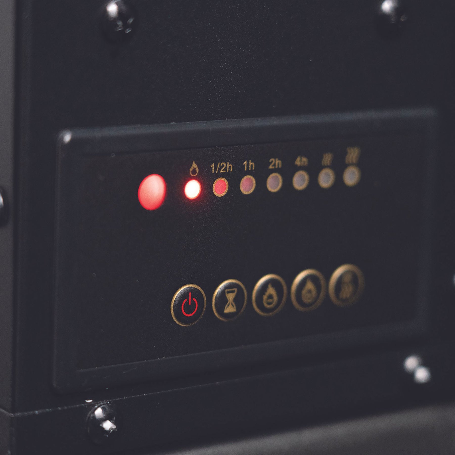 - Operate the fireplace via remote or panel, with added overheating protection and a timer for automatic shut-off