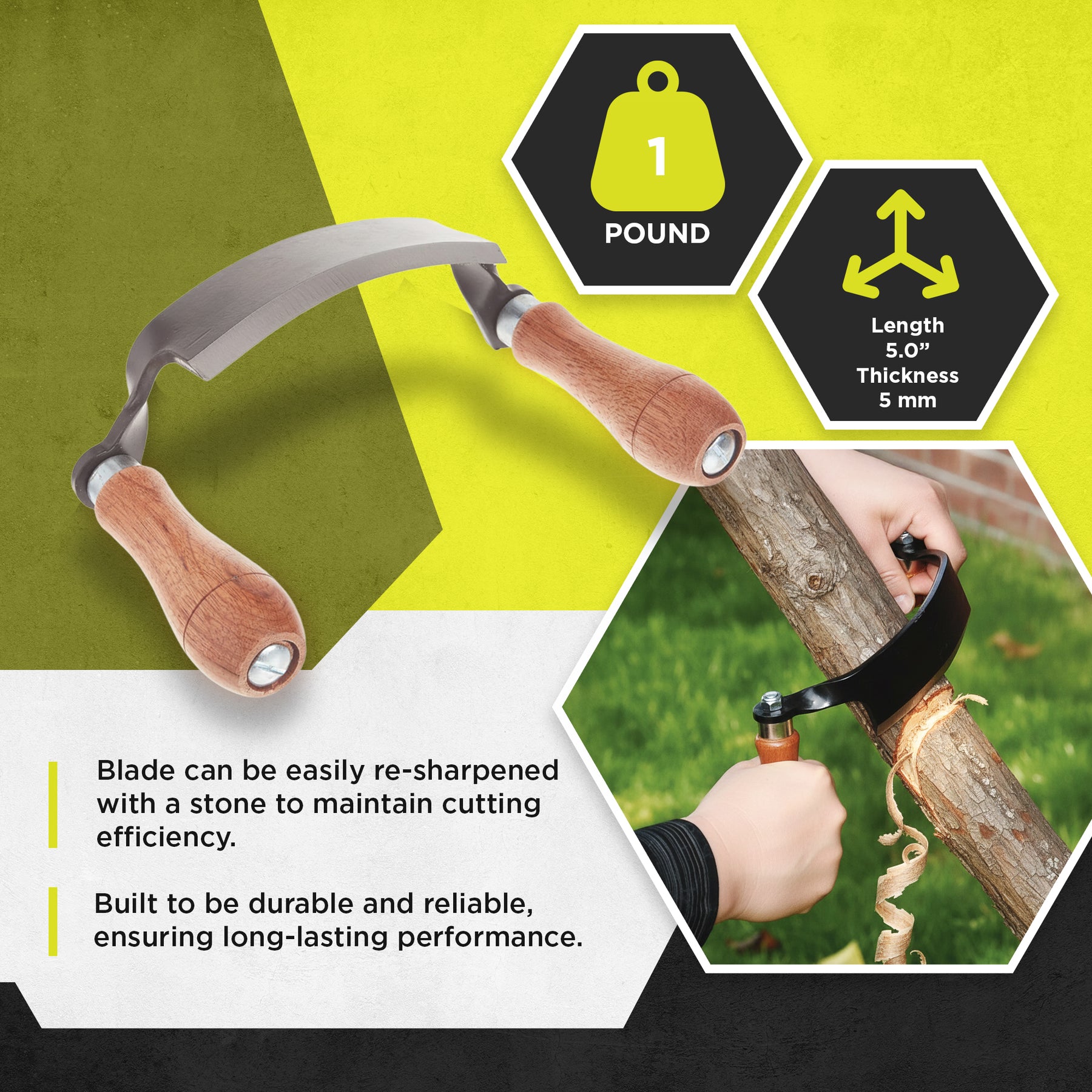 - Curved draw shave tool with a 5-inch ultra-sharp blade angled at 30 degrees, delivering accurate woodwork with minimal exertion