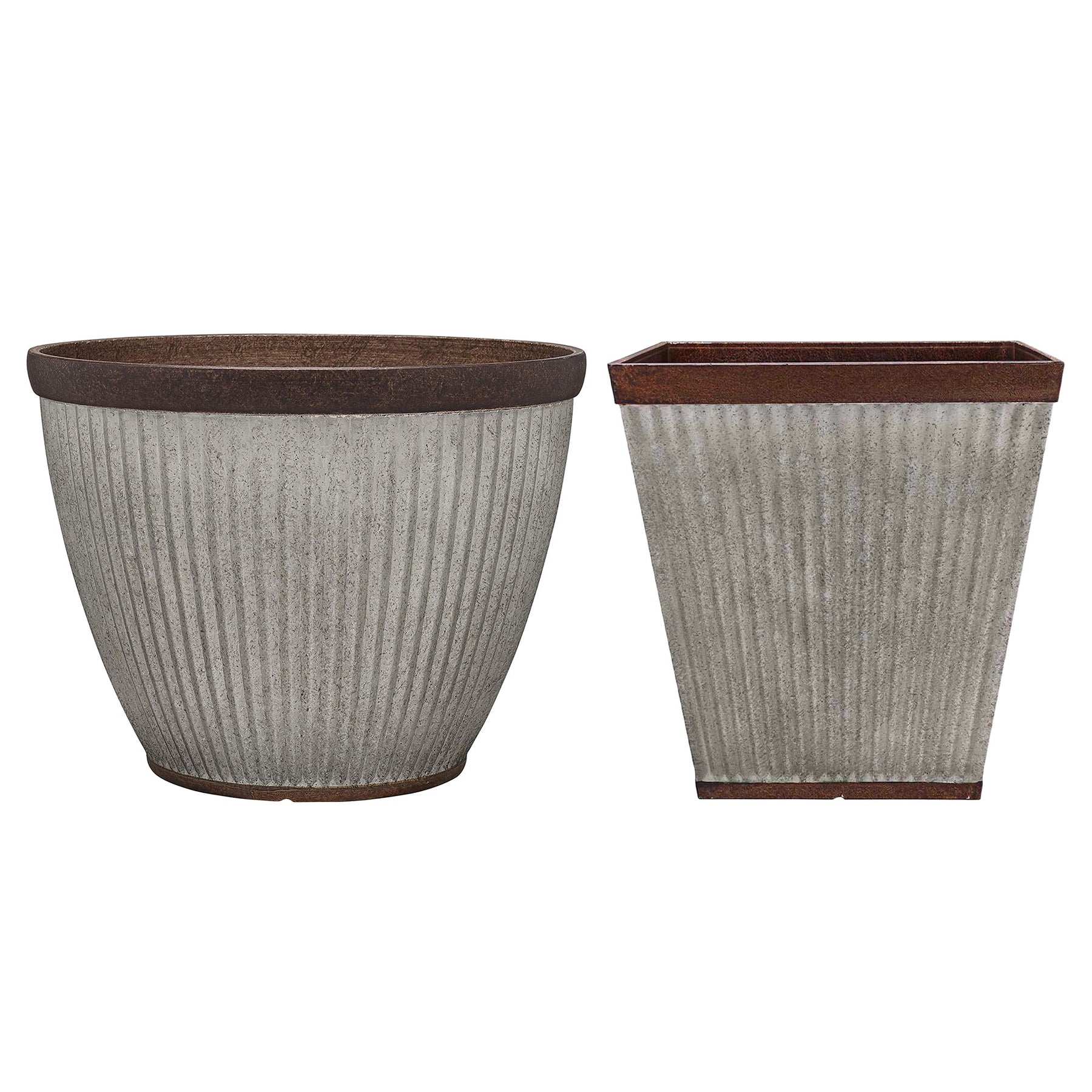 • Crafted from lightweight and durable resin with a corrugated look and faux galvanized finish