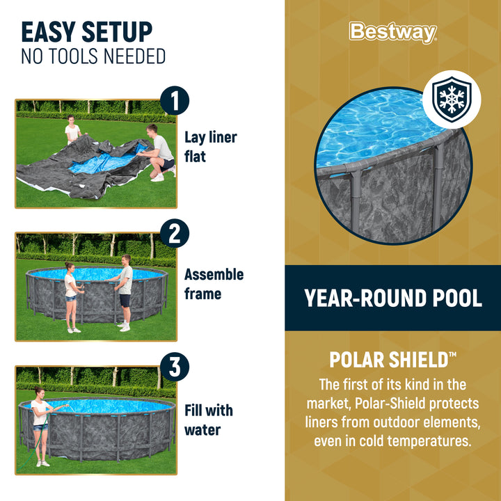 Transform your backyard into a swimming haven with the Bestway APX 365 Above-Ground Pool Set, designed for year-round enjoyment. This round pool combines long-lasting materials and innovative Polar-Shield weather defense technology, making it the first pool of its kind that stays assembled all year long, even through winter. Say goodbye to off-season storage - Polar-Shield protects the liner from outdoor elements, ensuring that the pool can handle cold temperatures and remain in top condition.