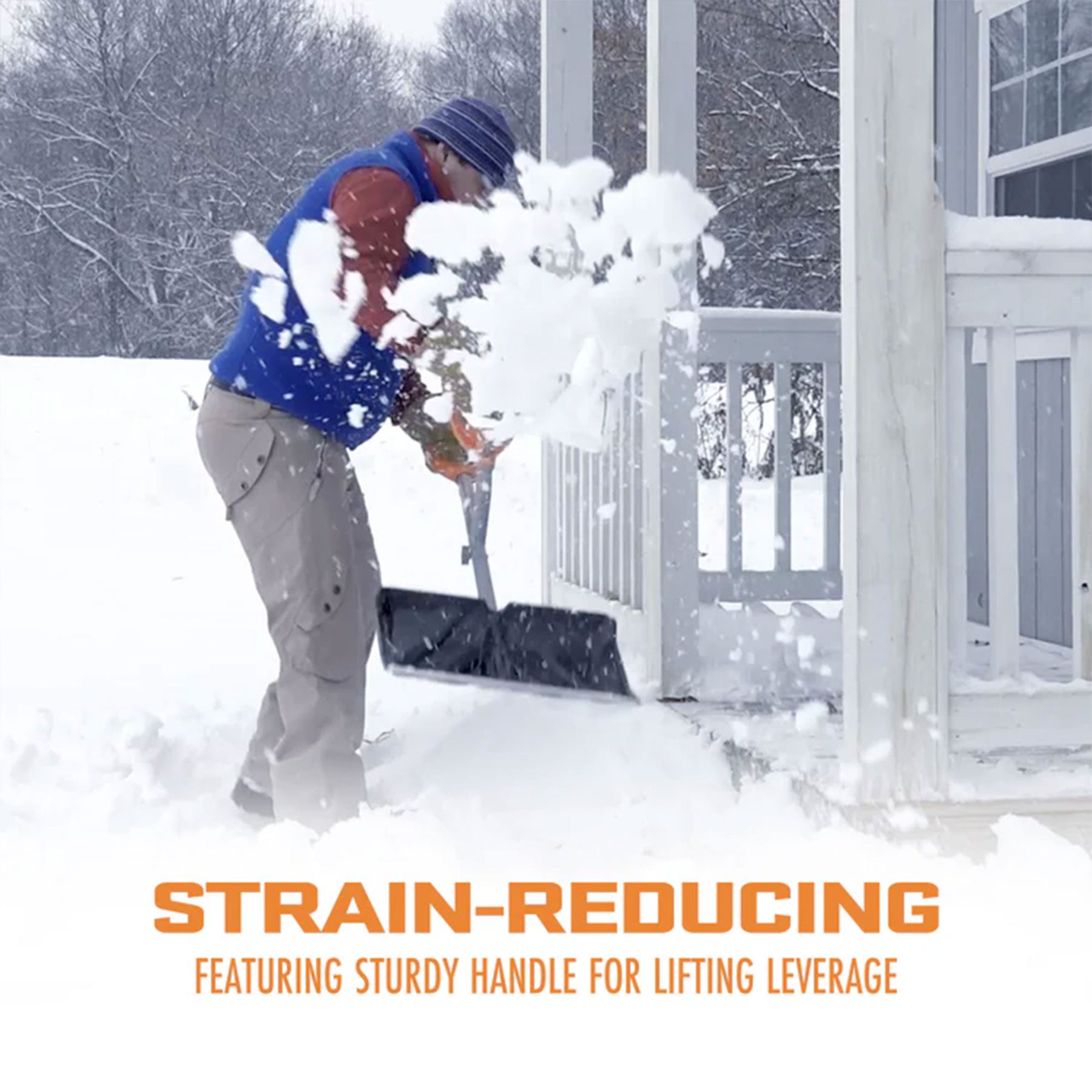 Hard-packed or deep snow takes muscle to move. Now you can cut the job down to size with the Ergie Shovel by Snow Joe. Featuring an ergonomic dual-handle design with durable D-grips for additional support and lifting leverage, Ergie Shovel lets you shovel smarter, not harder. Unlike traditional stick shovels that place tremendous strain on your lower back when you bend and scoop heavy loads of snow, Ergie Shovel changes the mechanics of shoveling to help reduce back strain. The wide 18" polypropylene blade with aluminum wear strip efficiently clears walkways and driveways right down to the ground without damaging your surfaces, while the 34.5" durable steel shaft ensures you can count on the Ergie Shovel season after season. This winter, Get Equipped with the Ergie Shovel from Snow Joe and leave back-breaking snow removal behind you.