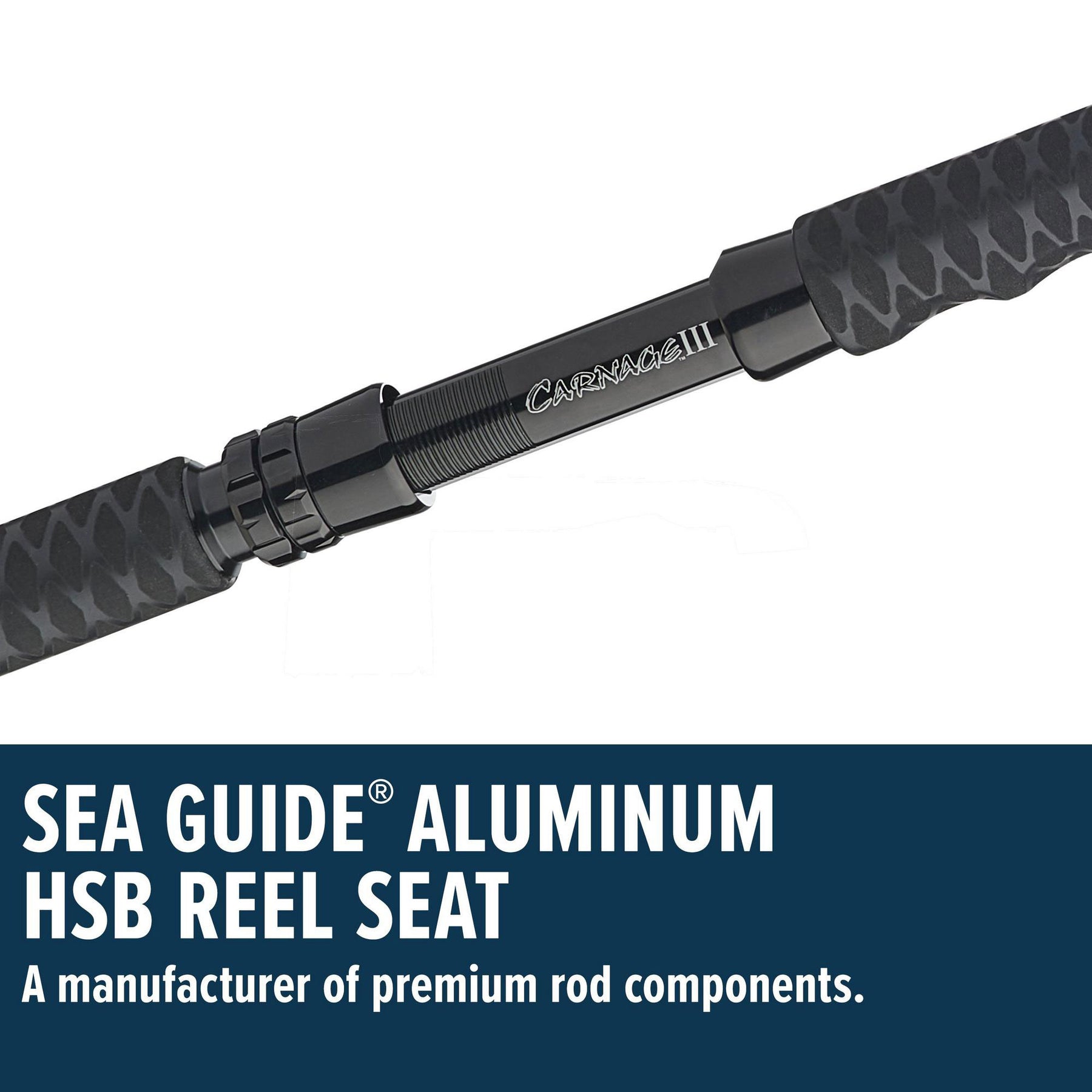 The Penn Carnage Series features a Sea-Guide aluminum reel seat that firmly secures your reel, offering steady performance and unmatched reliability. The guides promote smooth, friction-free line movement for better accuracy and reduced tangling. A full rubberized shrink-wrapped handle ensures a strong, comfortable grip, even when wet, allowing you to maintain total control through long fishing sessions. Every element of this rod is built with precision and crafted to withstand the challenges of serious angling.