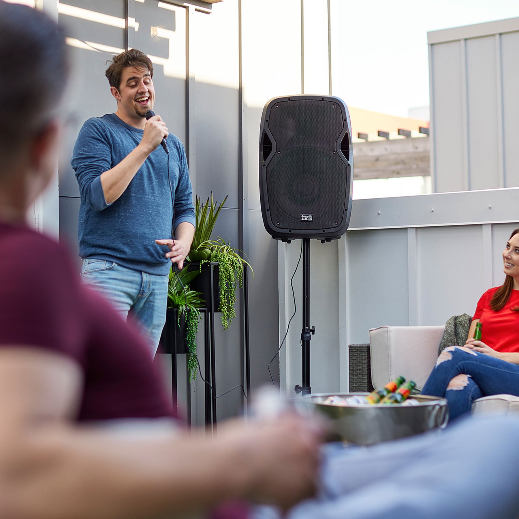 • Includes 1 powered Bluetooth speaker and power cable, 1 remote, 1 speaker stand, 1 wired mic with cable, and an instruction manual