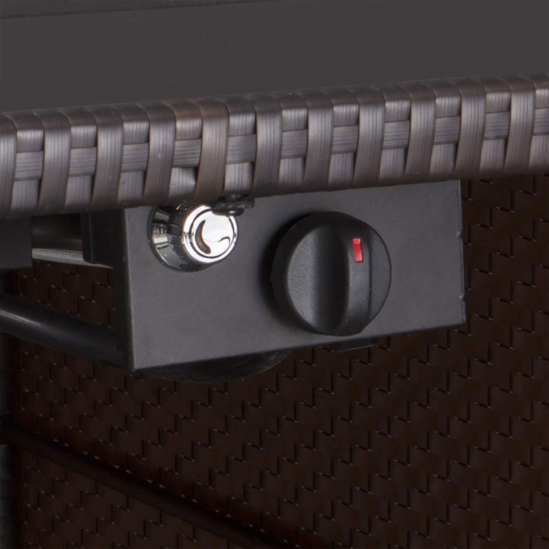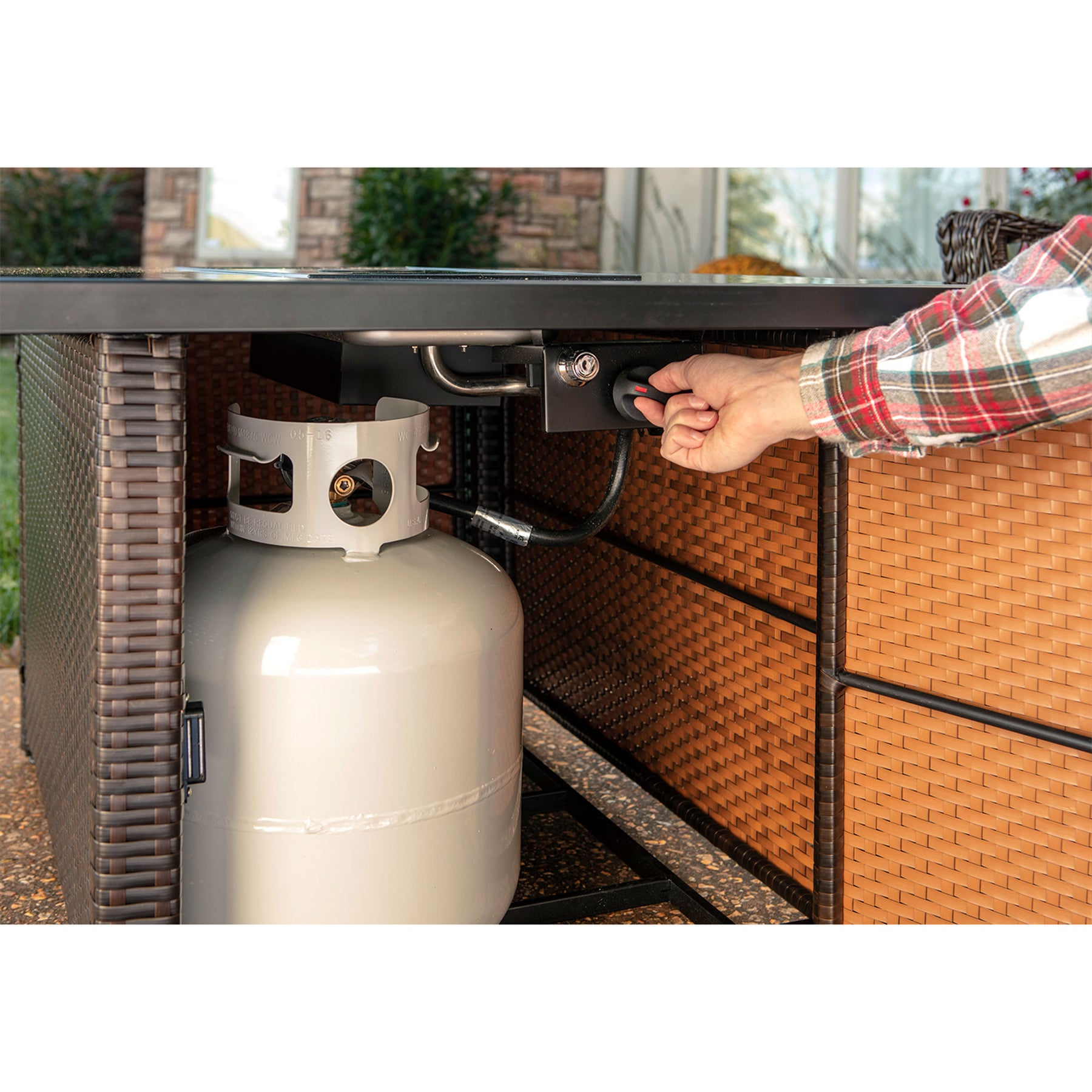 • Sleek, contemporary rectangular design with attractive white fire glass, jet black glass mantel, and brown wicker base; Center insert provides full table usage when fire pit is not in use