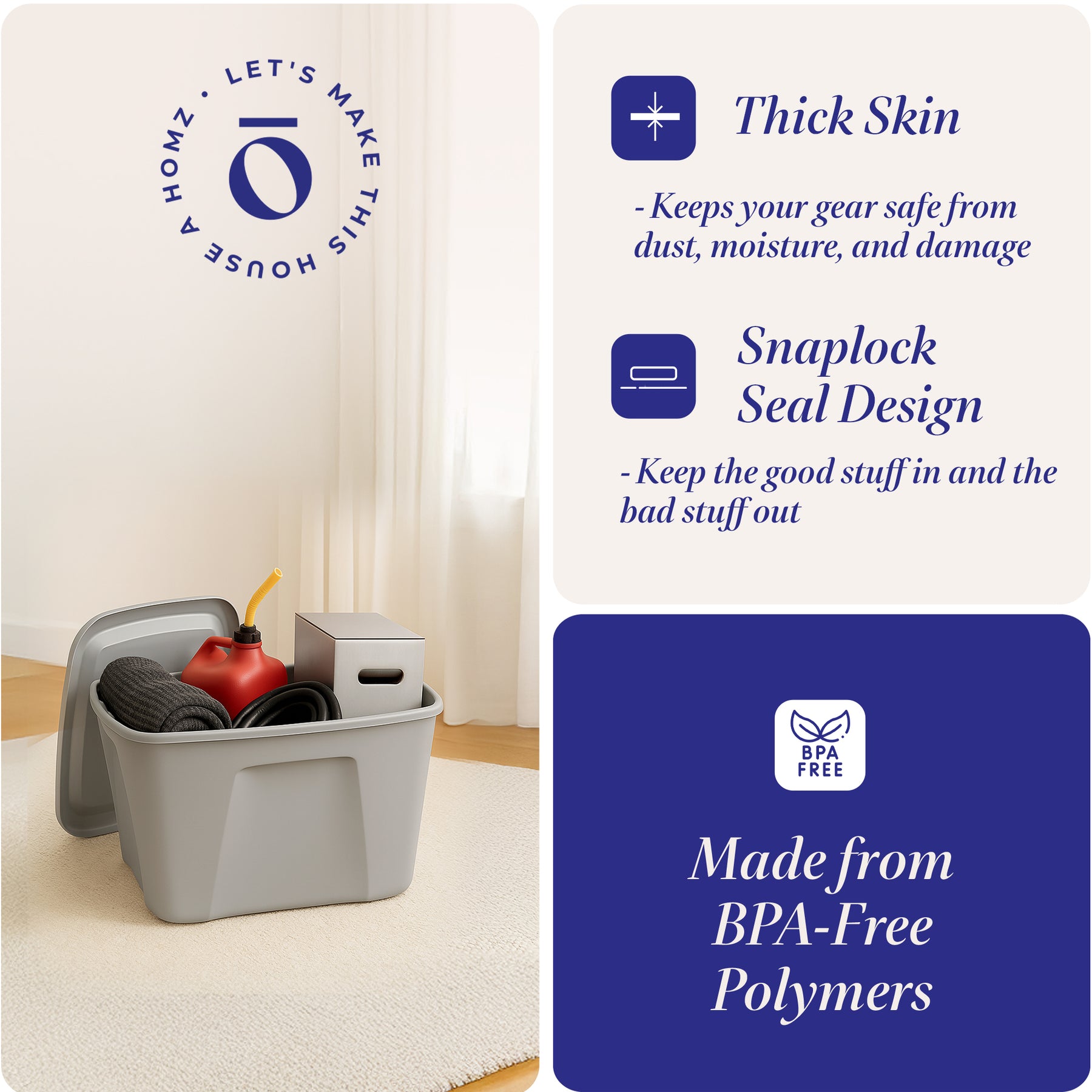 - Set of (8) durable storage container bins with a spacious 10-gallon capacity each that provides ample room for storing a variety of items