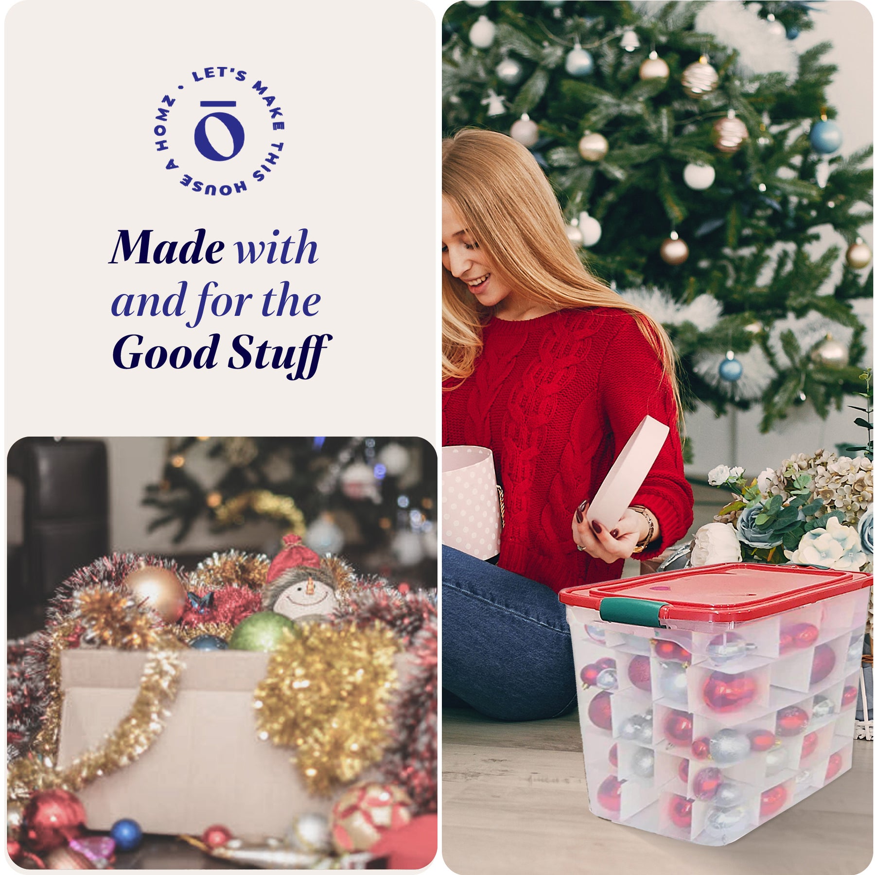 Made from durable see-through plastic that withstands ongoing use, this holiday storage container has removable dividers that provide space for ornaments and latching handles for comfortable transport and stacking. Most importantly, you don't have to worry about losing items since the lid features sturdy ergonomic latches locking the cover tightly and securely.