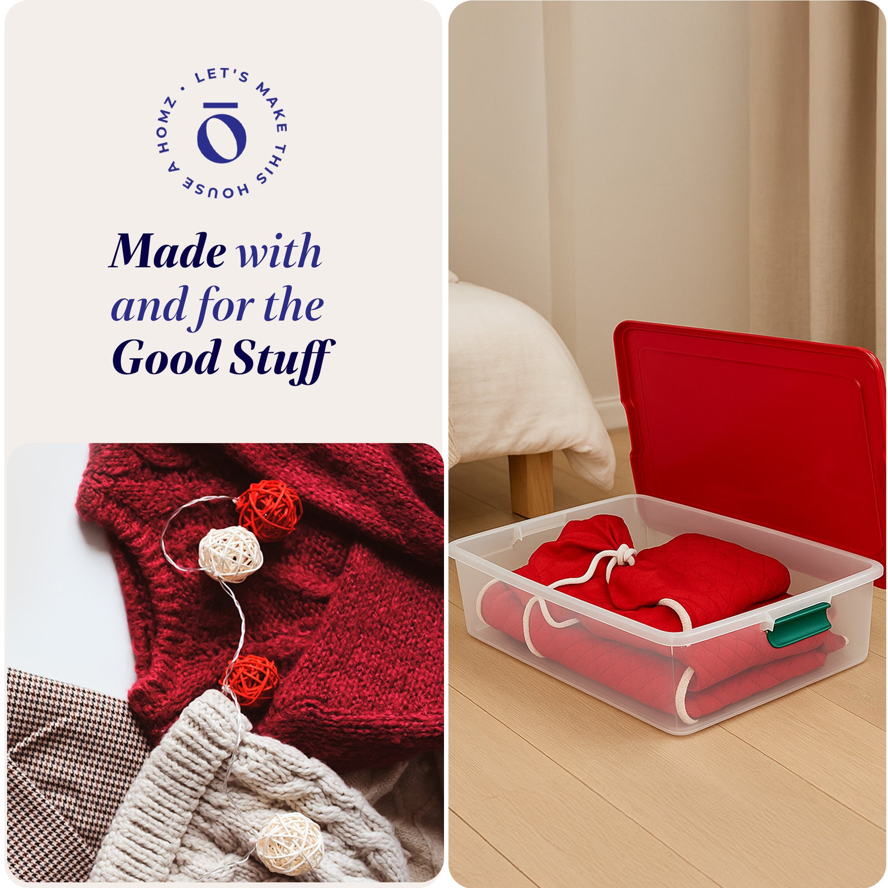 Keep the clutter away all year round with the 4-Pack of HOMZ 60-Quart Latching Holiday Underbed Storage Containers. With these totes, you can easily make homes spotless by having your favorite shoes, seasonal clothing, bedding, gift wrap, crafts, toys, and more neatly stored away.