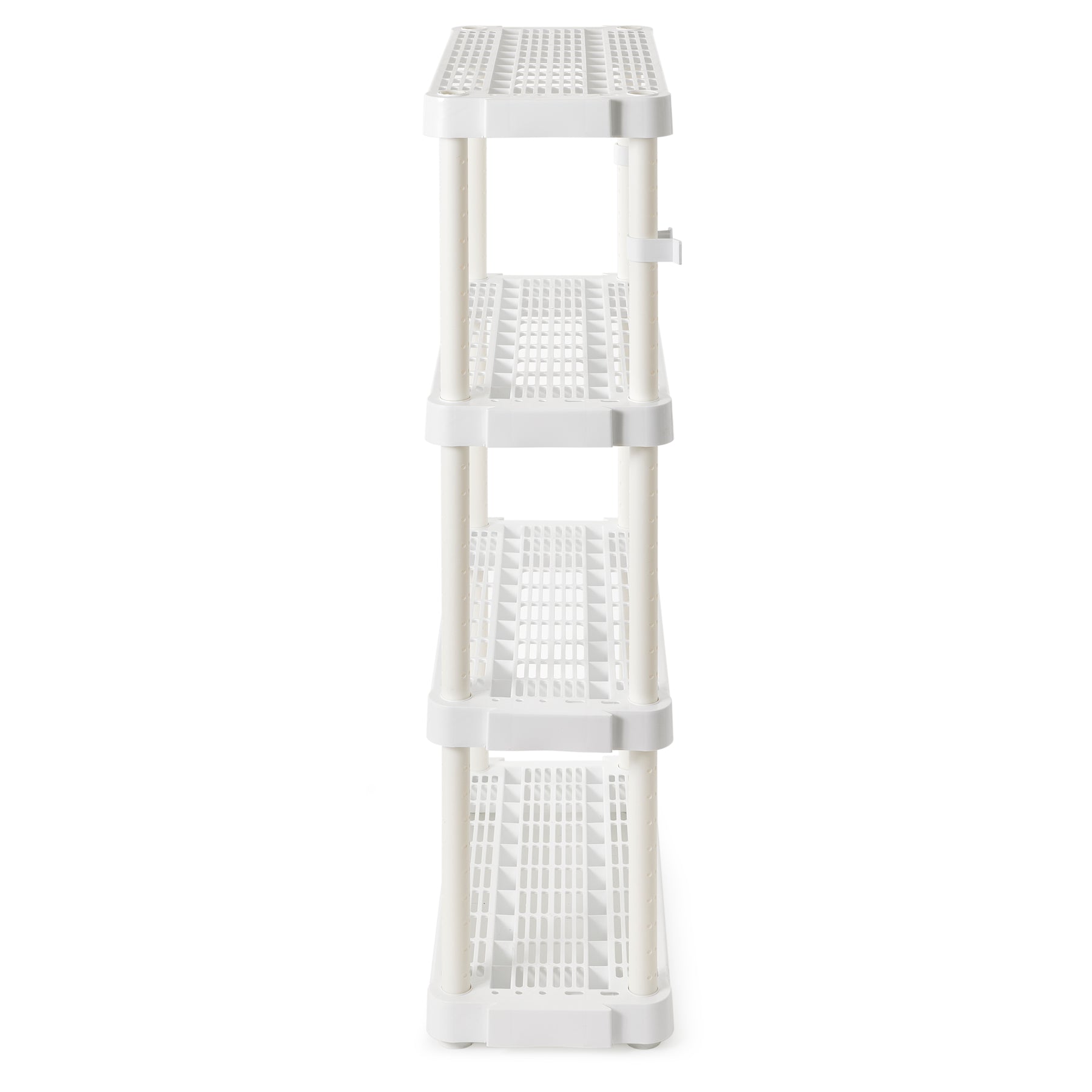 This bathroom storage shelf showcases timeless elegance for functional spaces with its lightweight, plastic construction and sleek color. Easily snap together for a simple installation process, and interconnect with additional units side-by-side for more storage space. Each ventilated shelf supports up to 150 pounds, providing a 600-pound unit capacity overall. Make sure that you distribute the weight evenly on the shelves for optimal, lasting use. With the adjustable 4 shelves, you can organize laundry supplies, seasonal clothing items, home decor, toys, crafts, or tools. Simply use the slide and lock technology to easily adjust the shelves. The closet storage shelf measures 32 inches long, 14 inches wide, and 54.5 inches tall offering a storage solution for any room. For added versatility, you can use the included brackets to mount the plastic shelves to the wall.