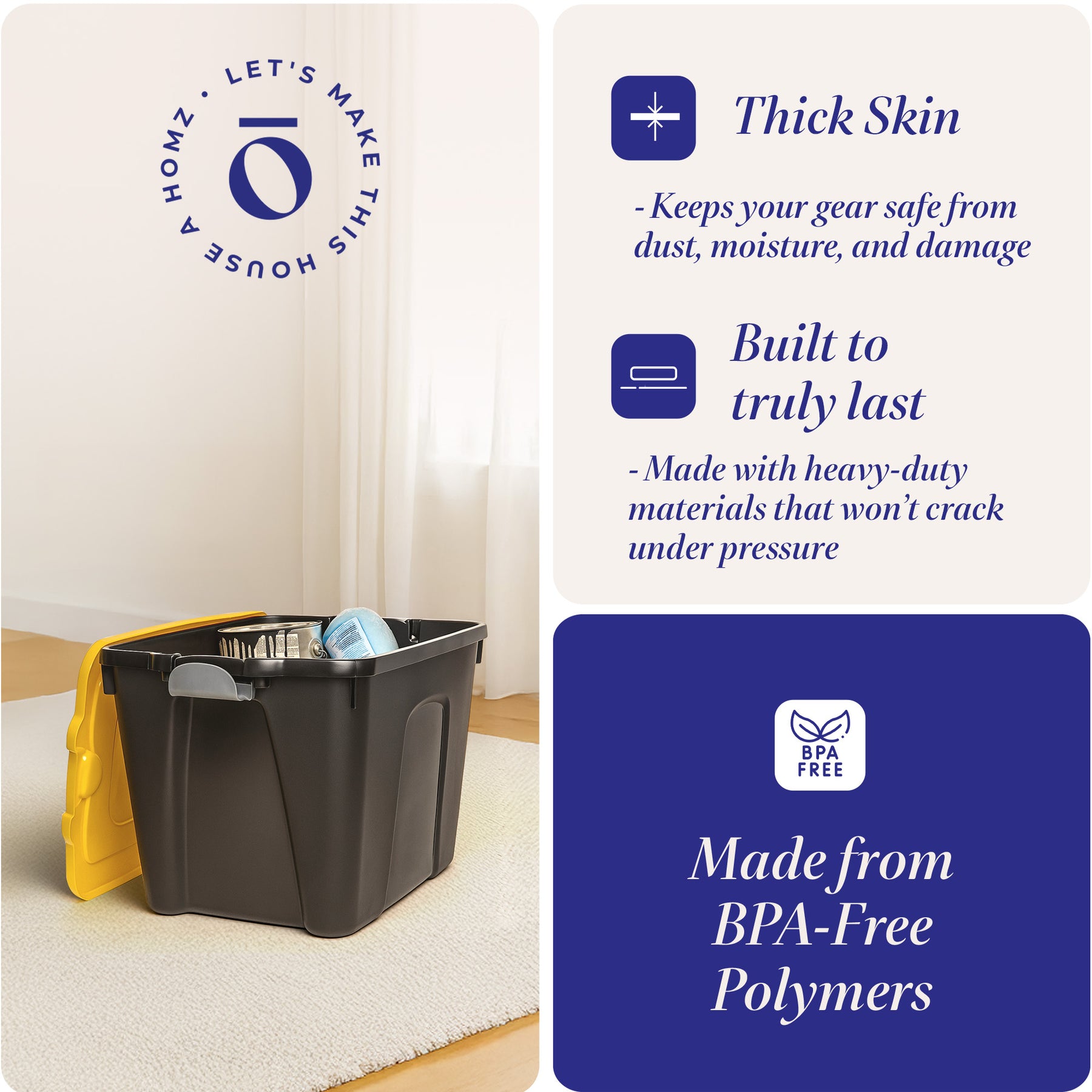 • Pack of (4) durable storage container bins with a spacious 22-gallon capacity each that provides ample room for storing a variety of items