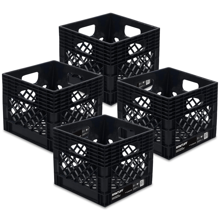 Ramtuff Storage Milk Crate, Plastic Organizer Box, 250lb Capacity, Black, 4 Pack