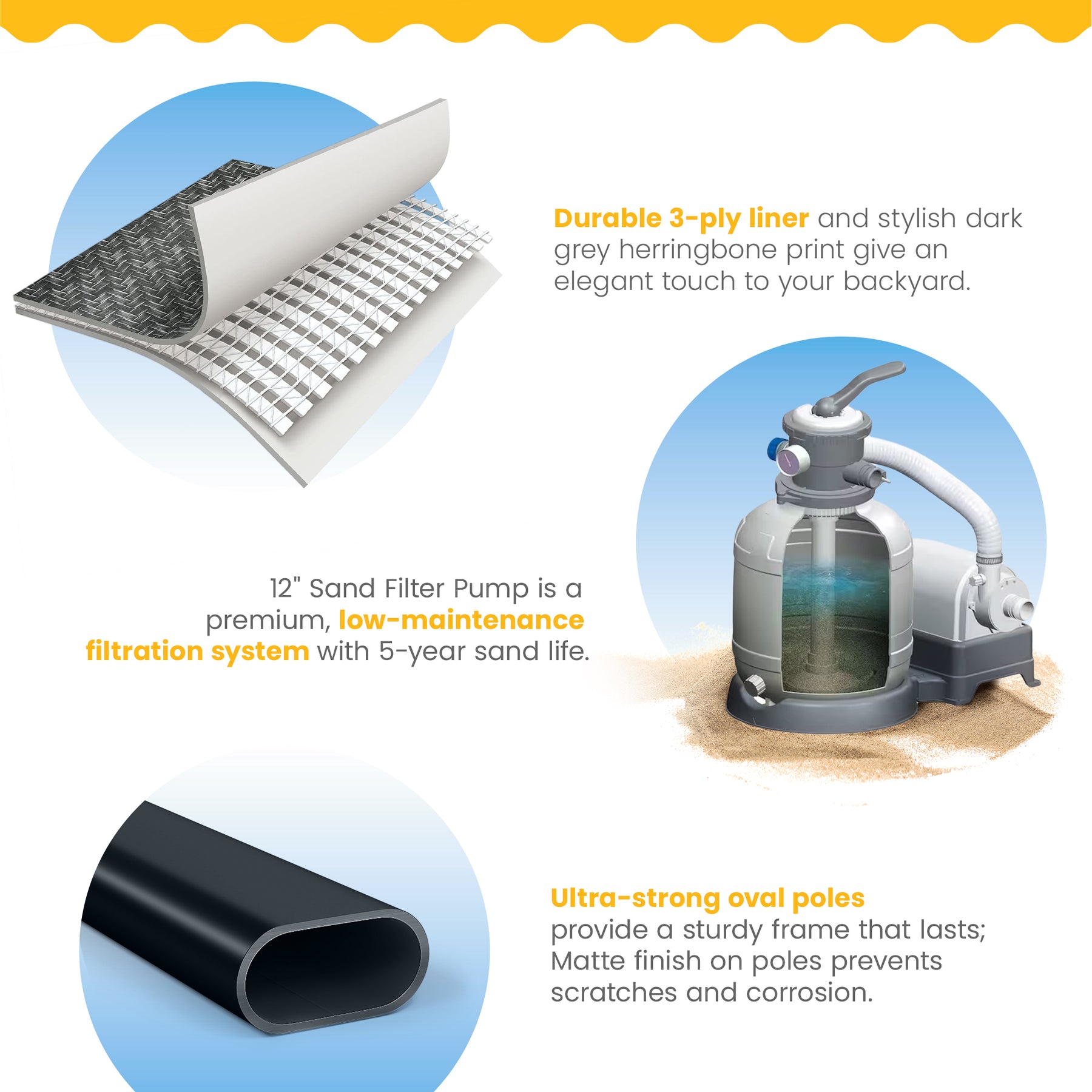 Featuring an elegant Dark Herringbone exterior print with a bright and delightful interior honeycomb print for extra flair, this pool for the backyard provides a modern style that accommodates up to 15 people comfortably. Made with durable 3-ply Toughmesh materials that resist punctures, this premium above-ground pool comes with a strong and sturdy metal frame to ensure the ultimate in durability and safety. The modern matte finish on the ultra-strong oval poles prevents scratches and corrosion. This pool comes with a 12-inch Sand Filter Pump and a JetMaxx Aeration feature, providing you with cleaner, purer water. It also includes a SureStep ladder to safely enter and exit the water. This 32ft oasis designer lap pool is best for those wanting to match their backyard style and patio decor.