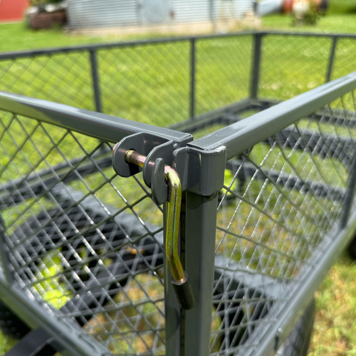 Equipped with sturdy running gear, this accessory's construction includes heavy-duty steel and four 13" pneumatic tires. These tires ensure stable travel over various terrains, making them perfect for use on uneven ground or rough paths. The welded steel rims add extra durability, so you can depend on this wagon for years to come.