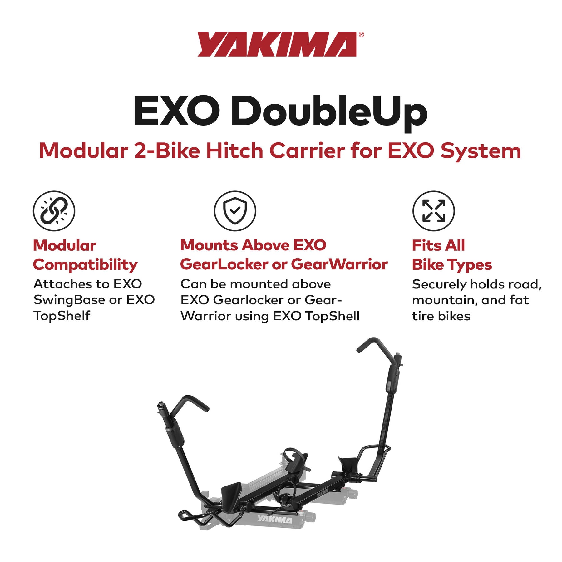 - Whether utilizing the EXO SwingBase for a pivot point or the second-tier EXO TopShelf for a secure perch, the EXO DoubleUp's adaptable configuration suits diverse biking preferences and terrains