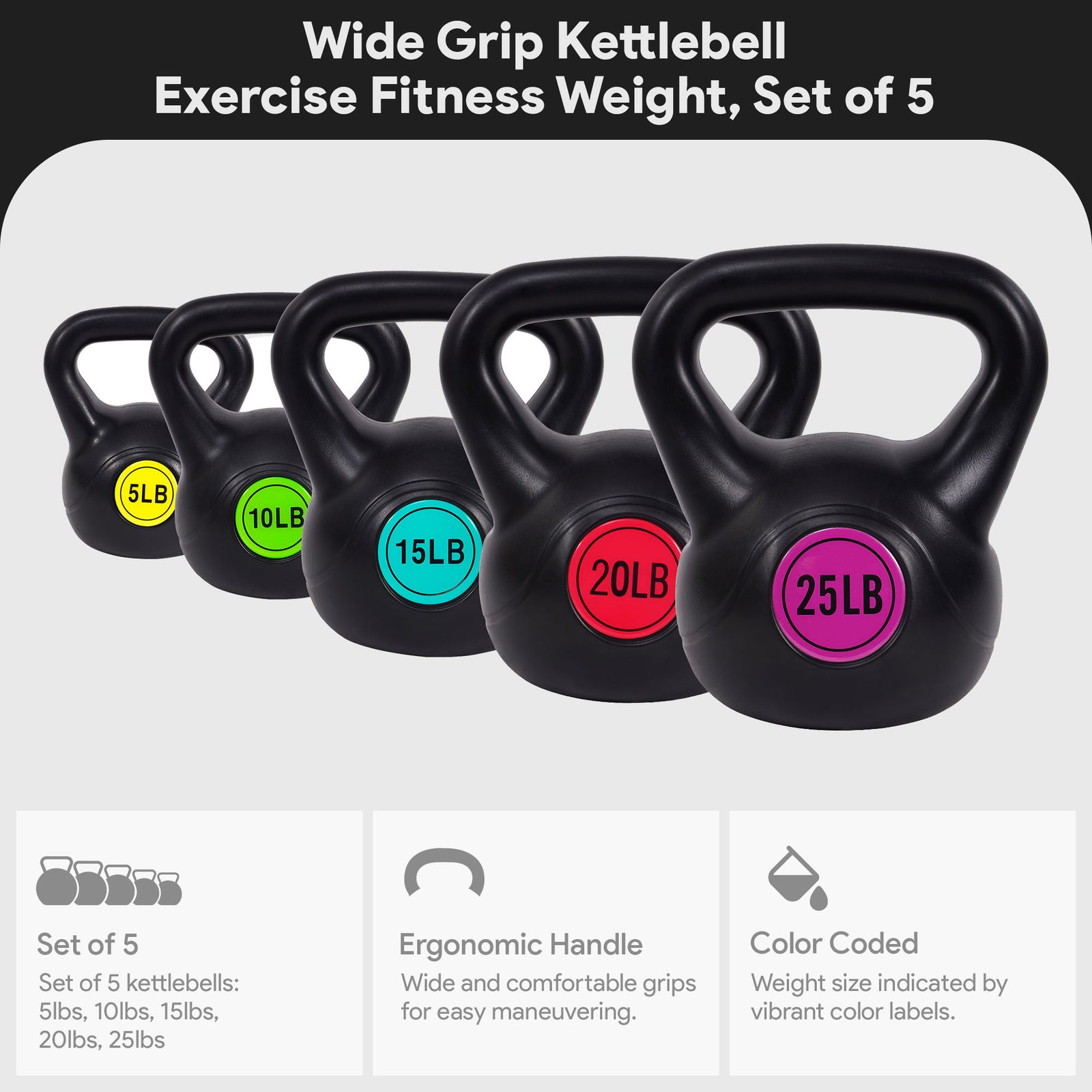Sporzon! Grip Kettle Bell Training Weight Set, 5, 10, 15, 20, 25lb (Open Box)