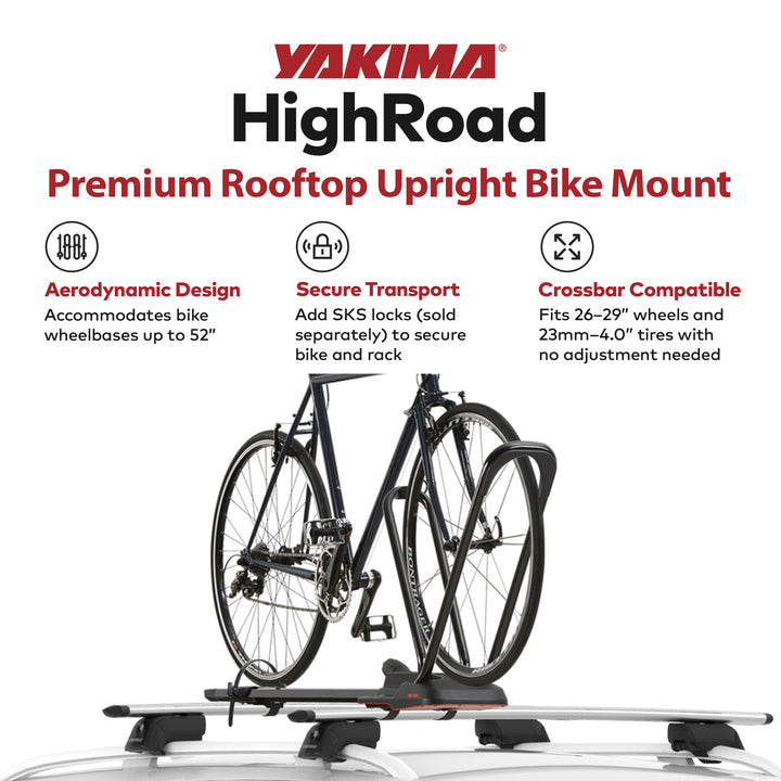 Meet the Yakima HighRoad Rooftop Upright Bike Mount, setting the standard for premium bike transportation.