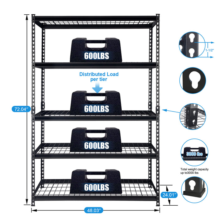 - Supports 600 pounds per shelf when distributed evenly and 3,000 pounds total