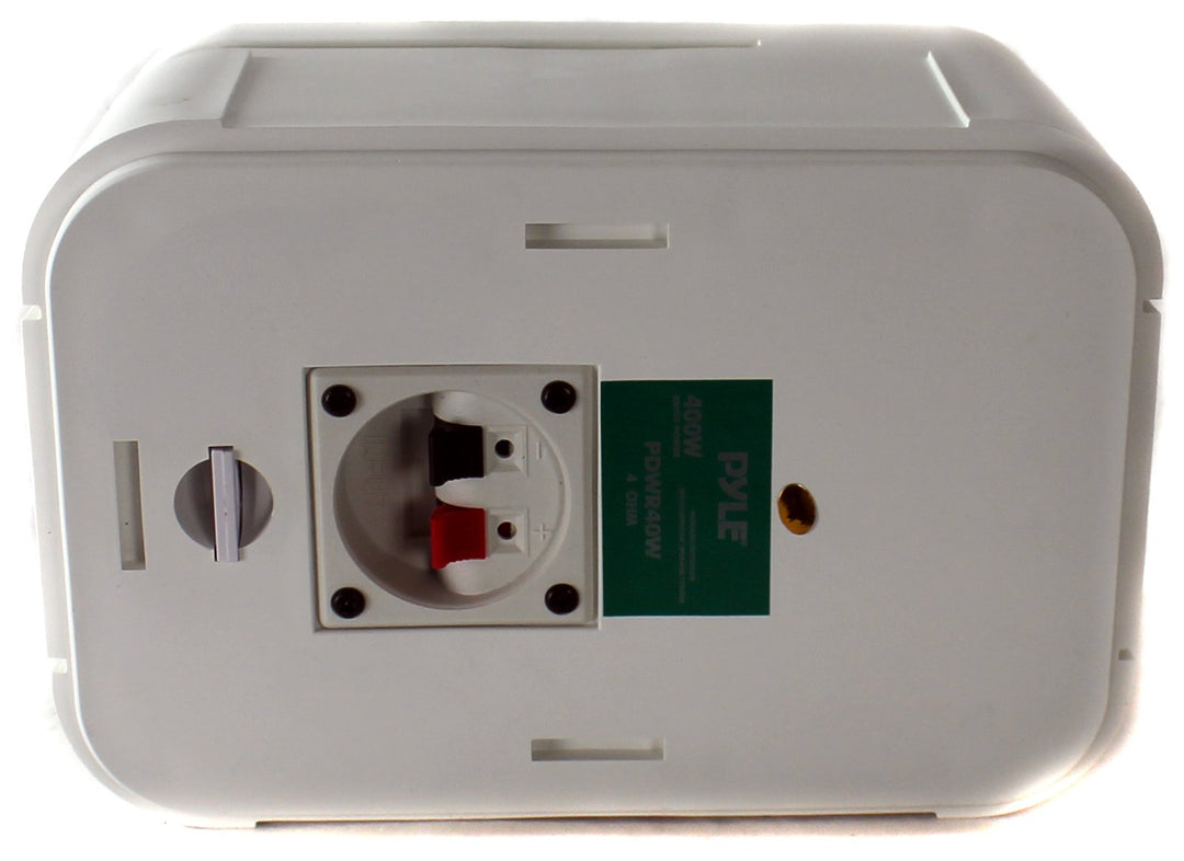 These certified refurbished, white Pyle indoor/outdoor waterproof speakers are excellent for use on boats, decks, patios, or by the pool - anywhere outdoors. They're completely waterproof, thanks to the heavy-duty ASB construction. And they're powerful - 400 watts max. A 5.25' aluminum injection cone woofer provides the midbass, while a 1' high compliance Mylar tweeter pushes sweet highs. A capacitor crossover network separates these two channels discretely for a brilliant sound. Connect wires easily and effortlessly using the quick-connect speaker terminals. The bass reflex vent boosts the bass response for a deeper, more powerful sound, ultimately delivering a frequency response of 40 Hz to 22 kHz. Mount using the unique spring-loaded mounting system. The mesh grills are rustproof. Sold as a pair.