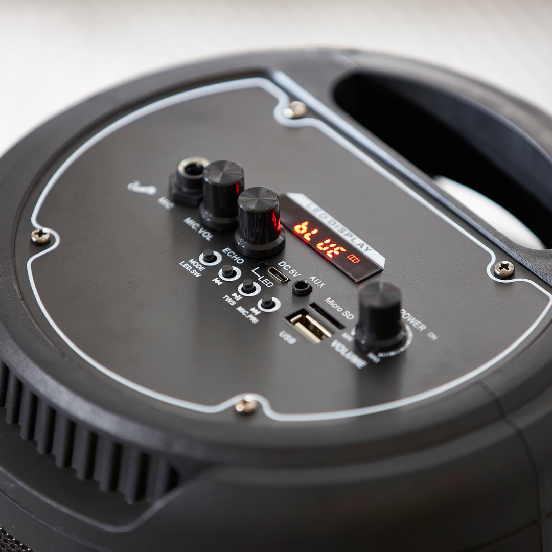 The portable karaoke speaker features a dual 6.5-inch subwoofer with 240-watt peak power. Get a full-range surround stereo sound with a bass response that will keep the party going. Let the subwoofer and tweeter provide full-range audio reproduction so you don't have to shout or yell. This set comes with a wireless microphone and remote control, and this system is designed with an FM radio with a digital LED display, USB flash drive and SD card reader, 3.5-millimeter AUX, and 6.5-millimeter microphone input. This speaker features multi-color flashing disco LED lights to add to the party ambiance.
