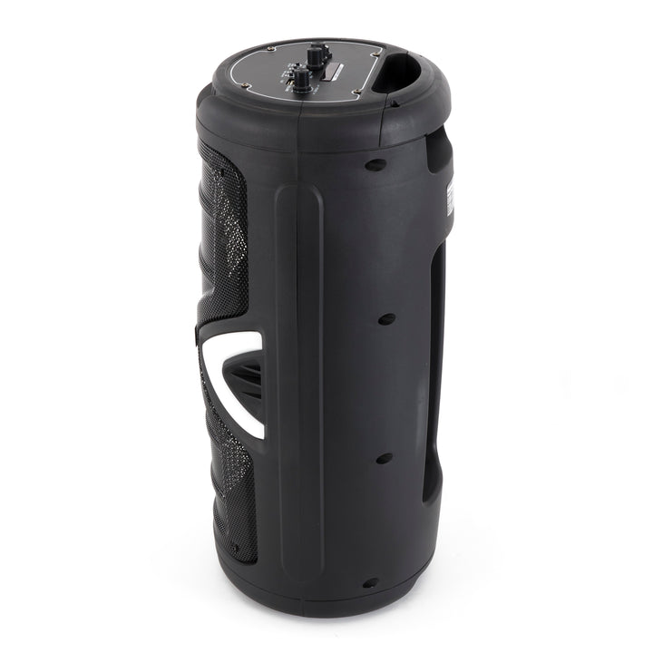 • The portable karaoke speaker features a dual 6.5-inch subwoofer with 240-watt peak power