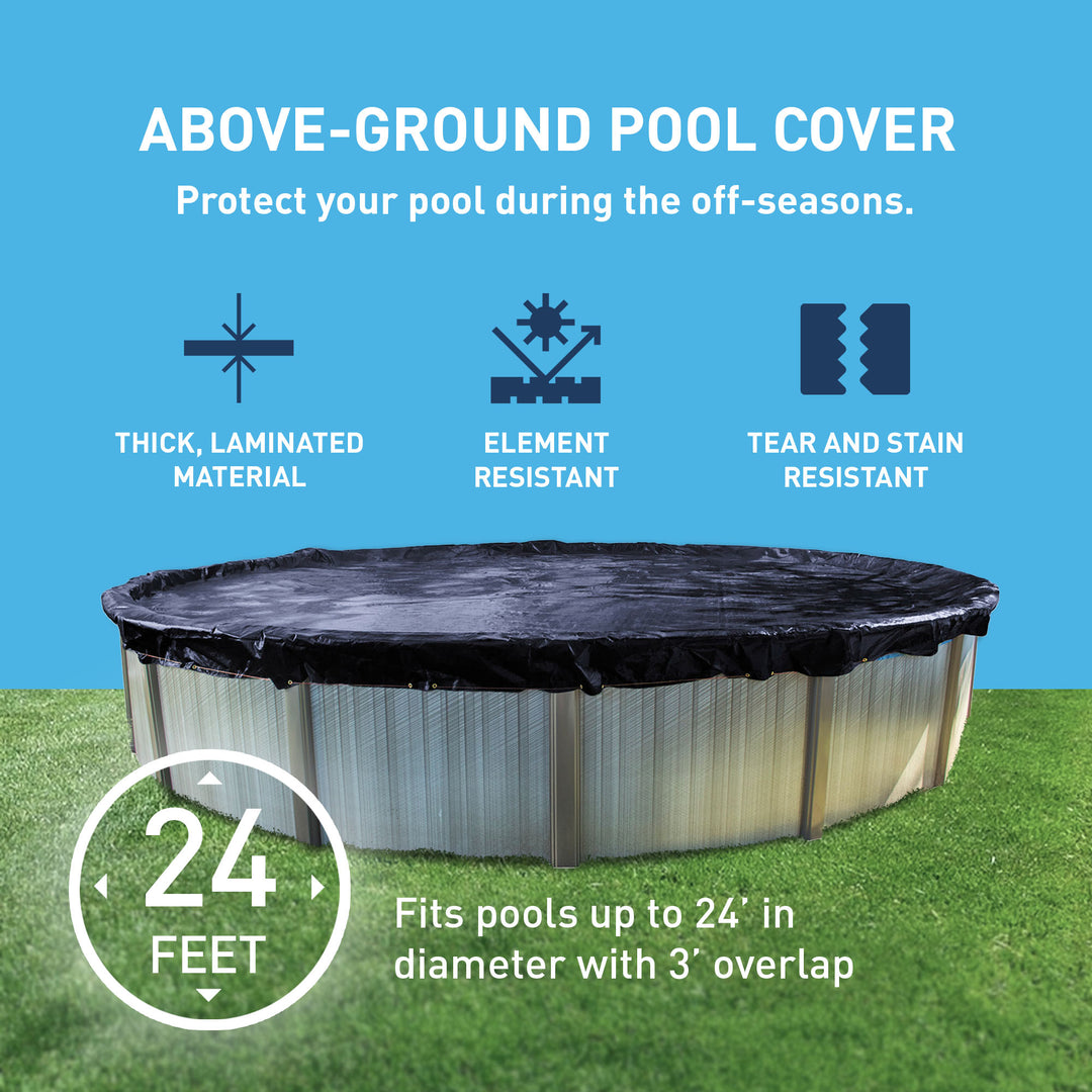 This Pool Cover is made of laminated polyethylene sheeting woven with thick, high-density polyethylene stitching ensuring superior tensile strength and durability. Winter above-ground pool covers feature a ratchet and cable system featuring high-test vinyl-coated cable. Designed to fit over pools that are 24 feet around and have a 4-foot overlap to ensure the entire surface of the pool is covered and keep any debris out.