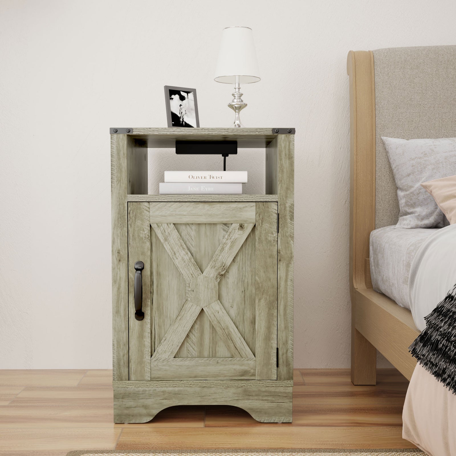 RoyalCraft Nightstand, Bedroom Table w/Charging Station, Light Grey (Open Box)