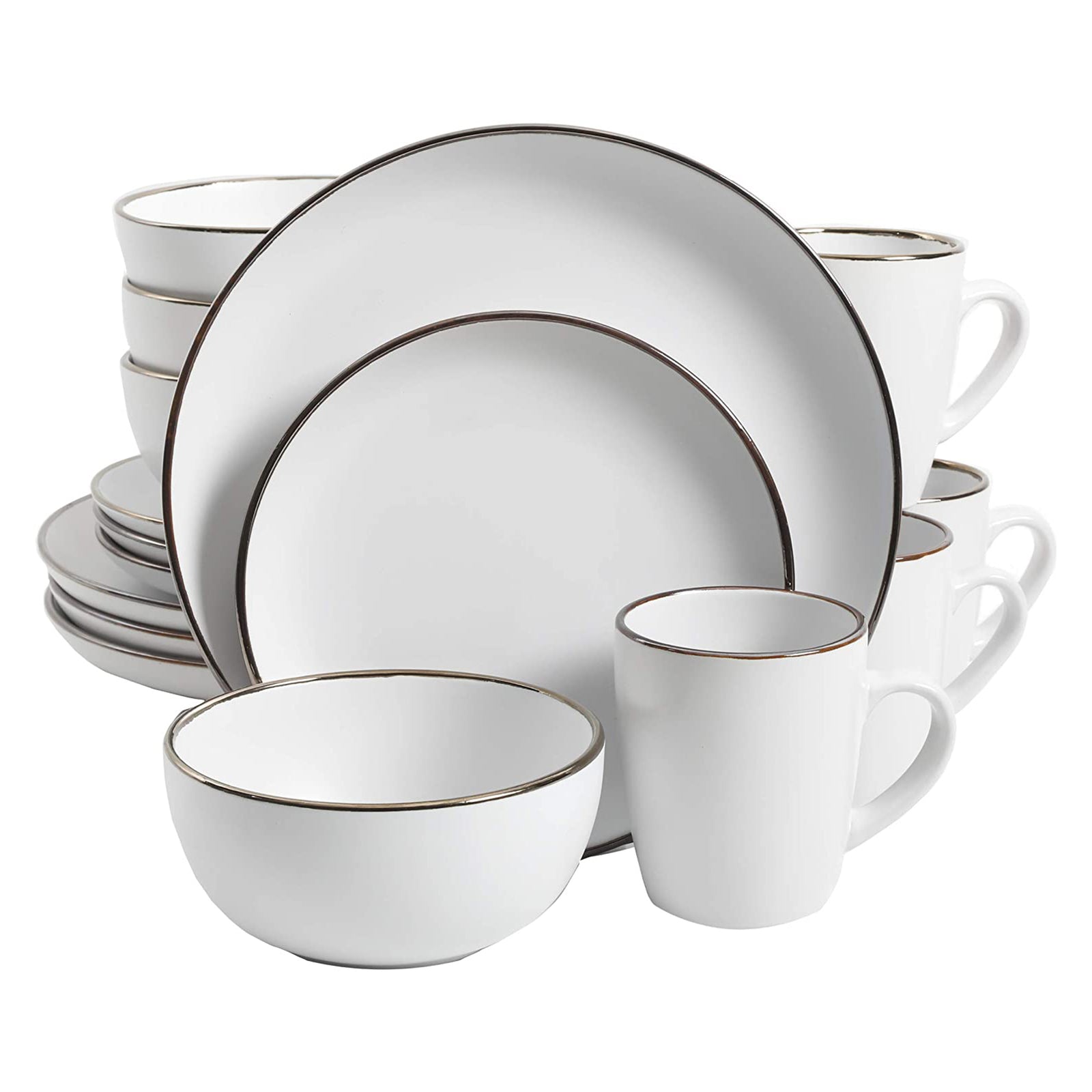 Gibson Home Rockaway Round Stoneware Dinnerware, Service for 4, Grey w/ Gold Rim